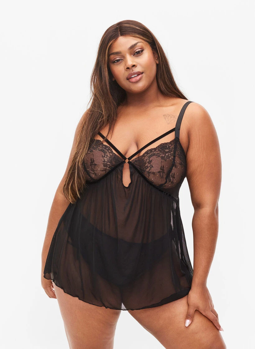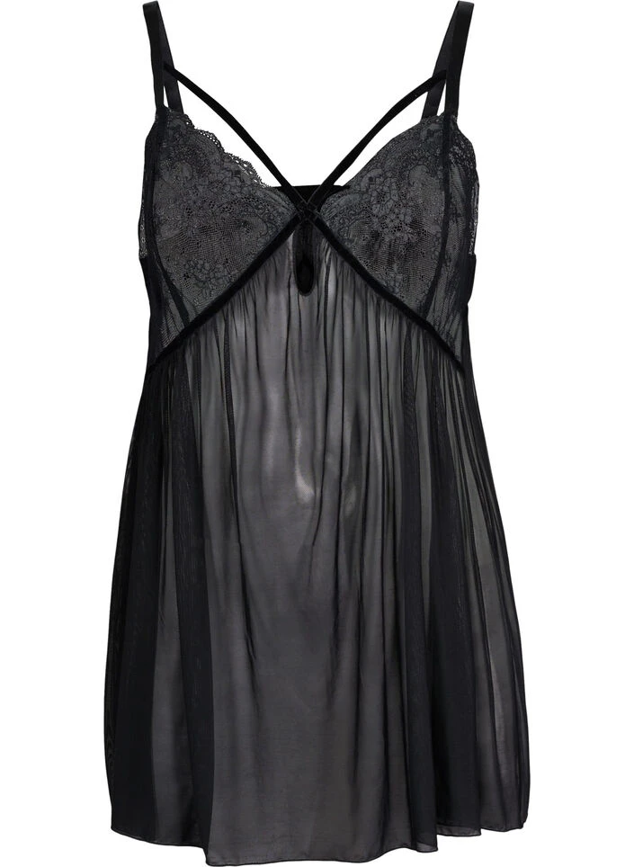 Feminine chemise in transparent fabric, with beautiful lace on the bust. The chemise has string details, narrow adjustable shoulder straps and is elastic at the back.