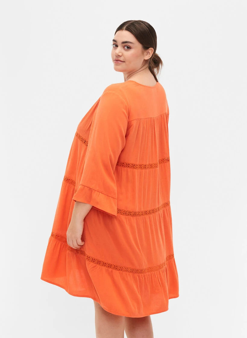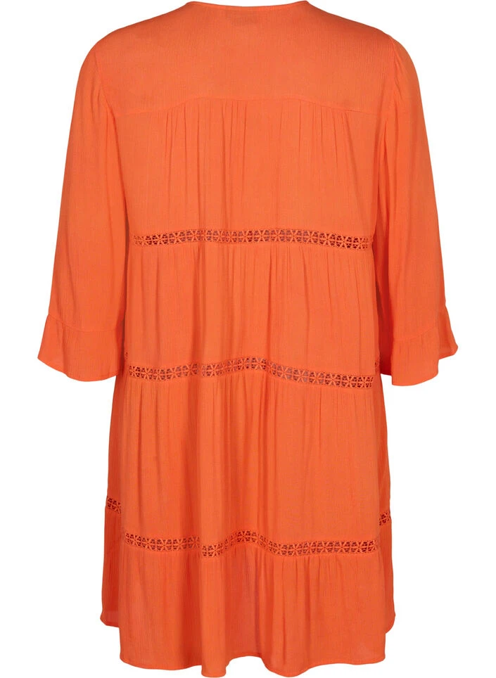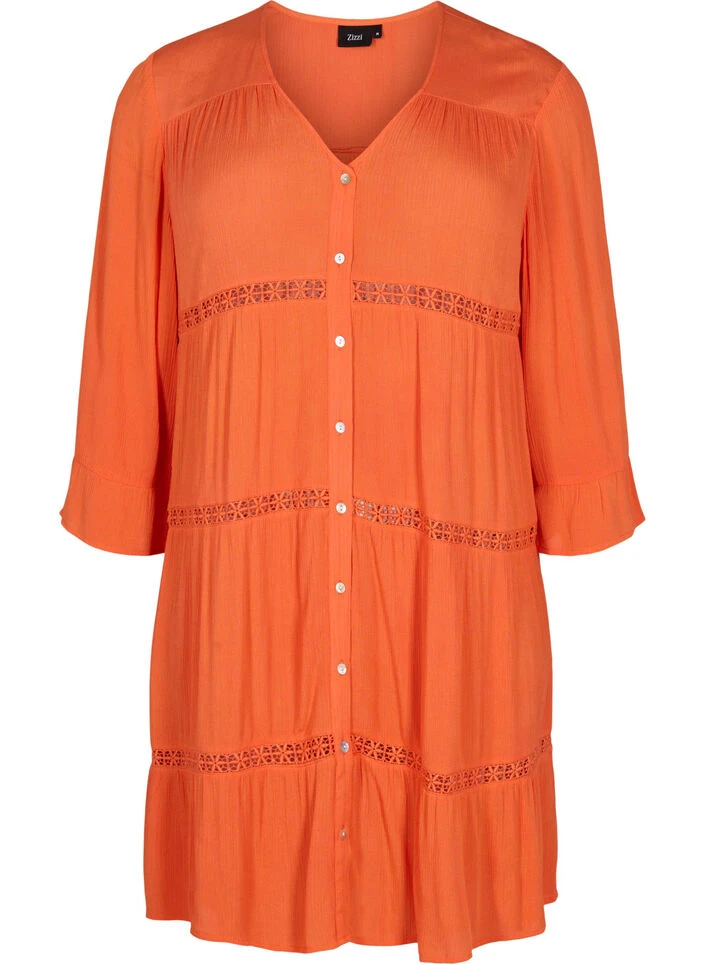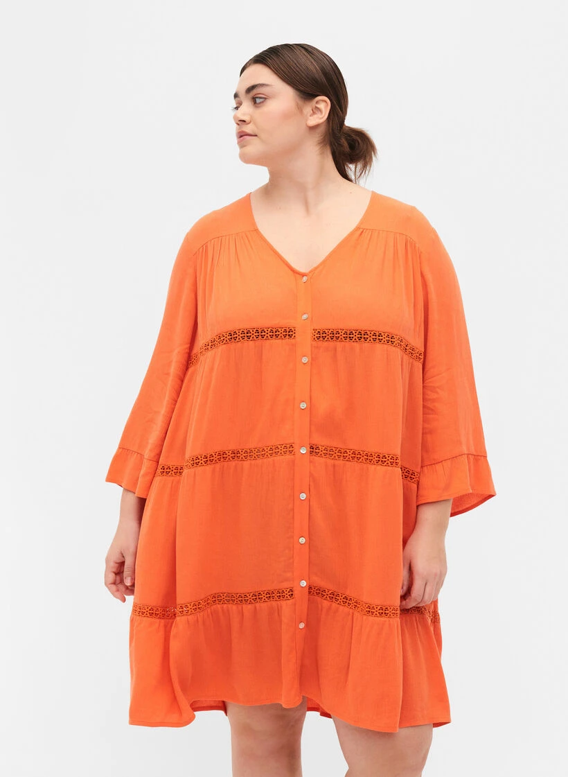 Button-through beach dress in 100% viscose, which has a v-neckline and 3/4 sleeves. The dress has feminine lace details and a loose a-shape which falls easily on the body.