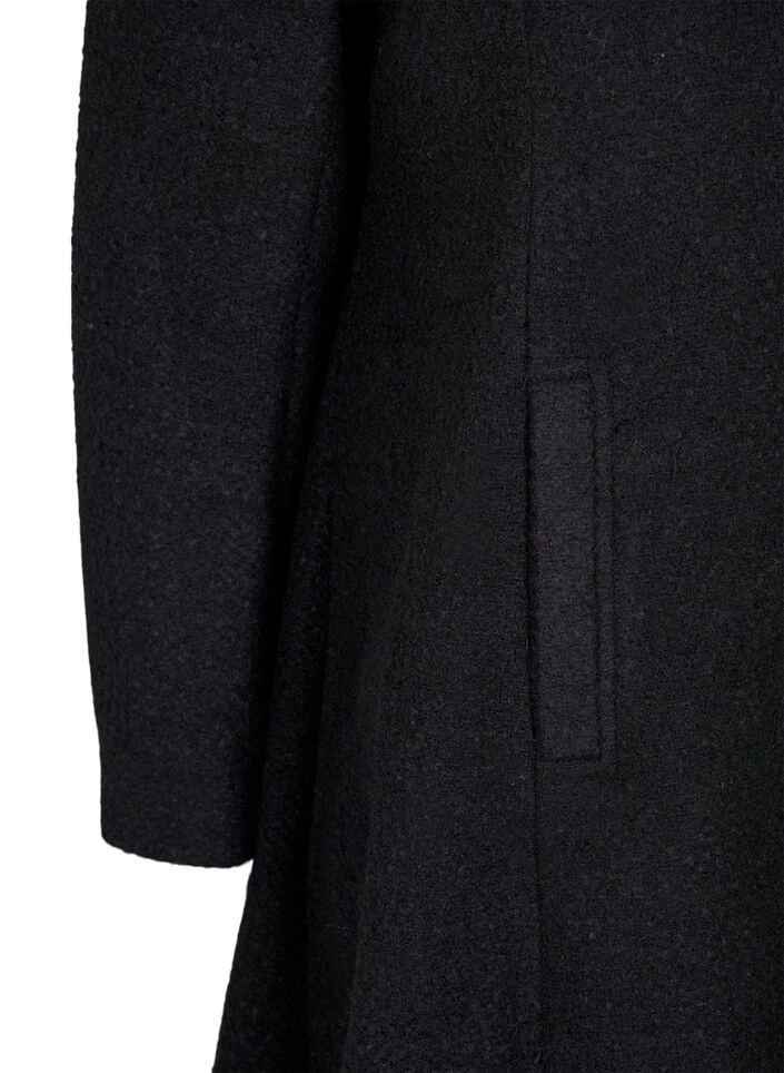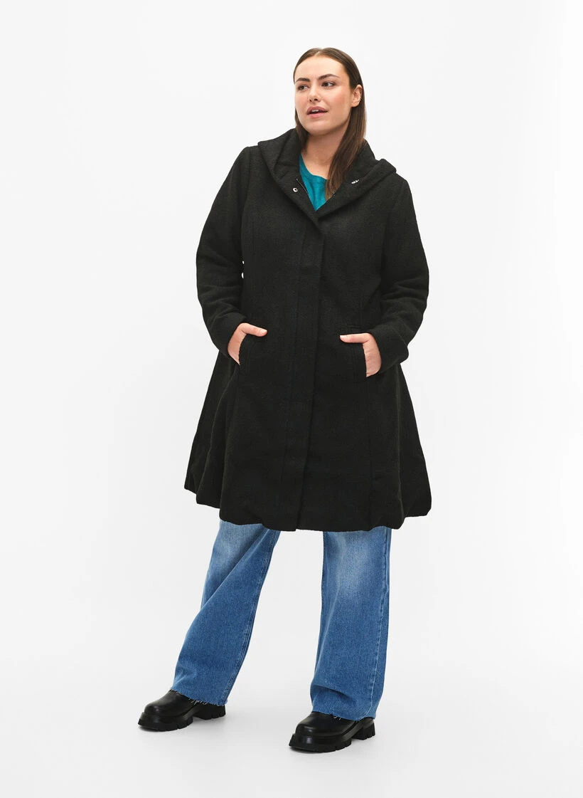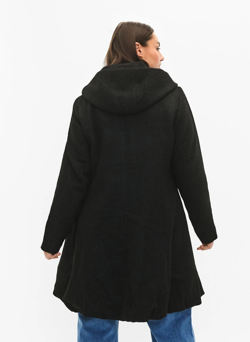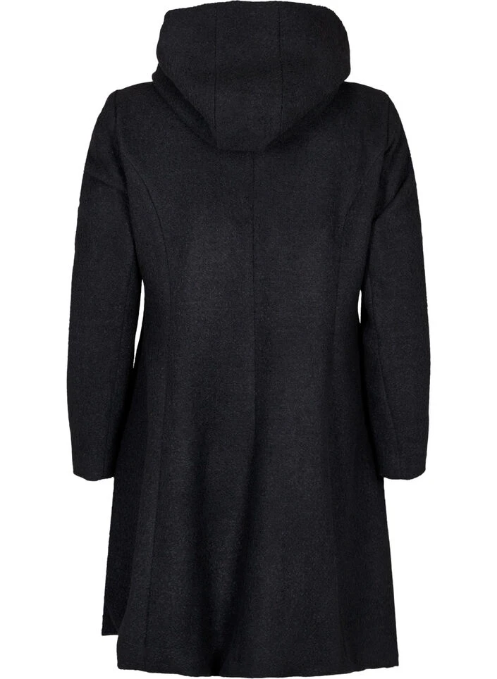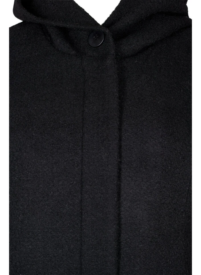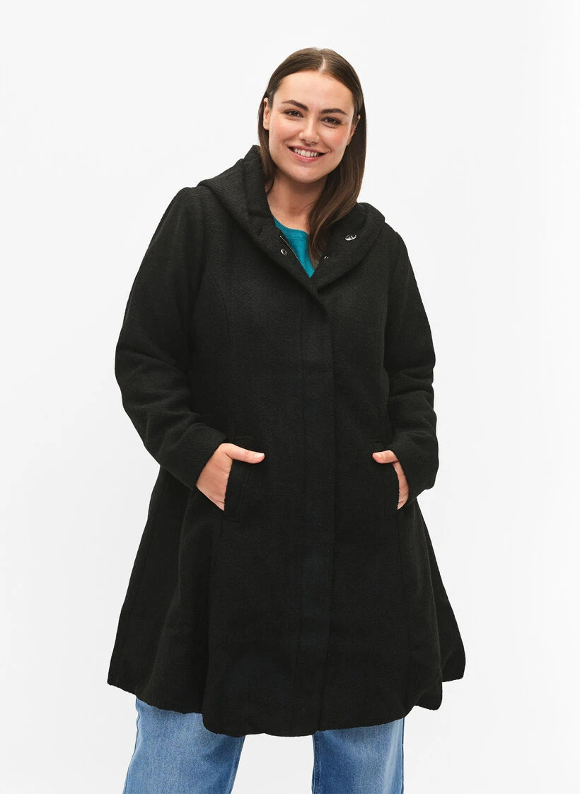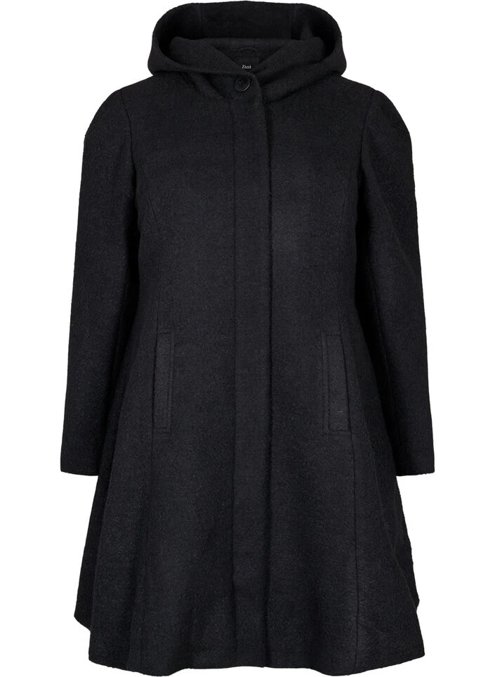 Windproof coat in beautiful bouclé, featuring a feminine A-line silhouette with extra width from the waist down. The coat has a hood, concealed two-way zipper closure, and a single button at the neck, as well as pockets on the sides.