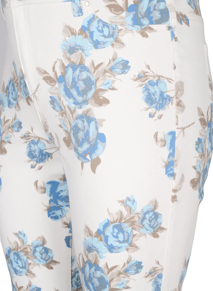 Capri jeans with a feminine floral print, made from a soft and stretchy cotton fabric. These jeans have belt loops and back pockets and a super slim fit with a high waist.