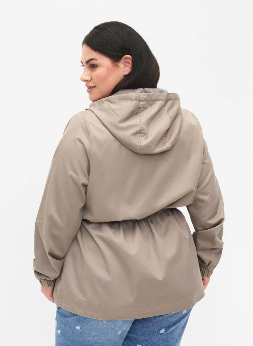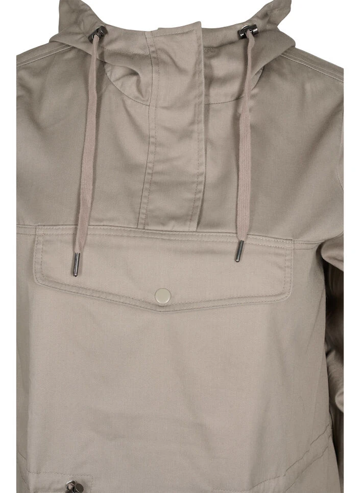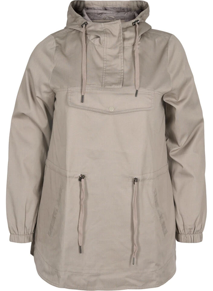 Simple anorak in a comfortable material with cotton, which makes it extremely comfortable to wear. It has a hood with adjustable drawstring, front pocket with button closure, side pockets and elasticated cuffs. The waist can be adjusted with a drawstring for a more feminine silhouette.