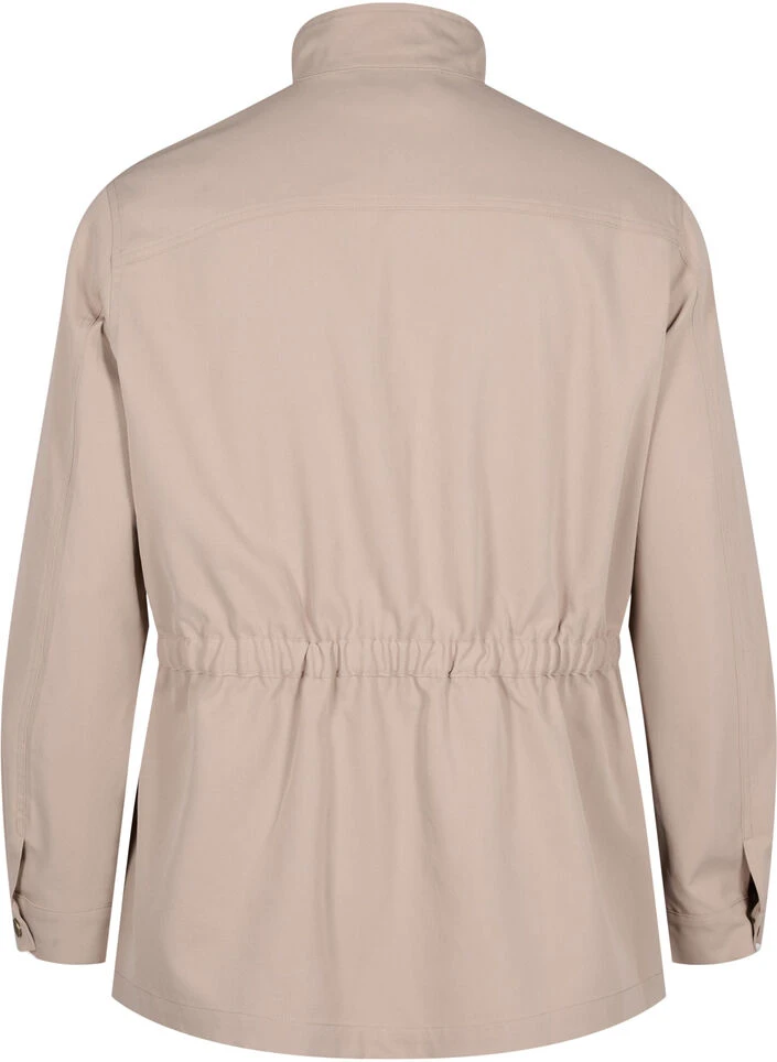 Cool army jacket with concealed zipper, stand-up collar, two side pockets and two chest pockets. The jacket is made from a soft viscose fabric with an elastic waist at the back and a waist tie at the front to create a beautiful silhouette.