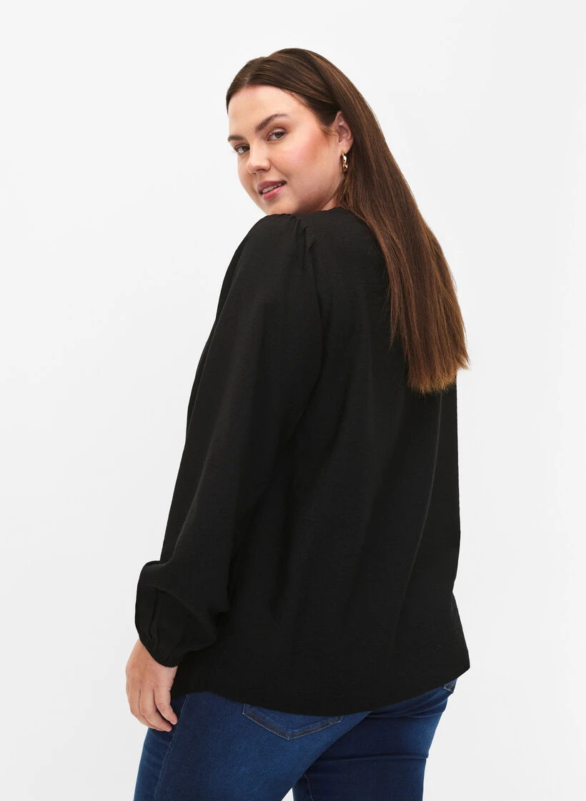 Blouse in soft viscose with a fine crochet detail at the neckline and keyhole closure at the neck. The blouse has long sleeves with elasticated cuffs and small pleats on the shoulders that create a slight puffy effect.