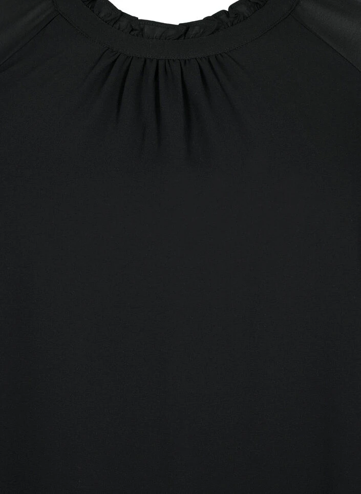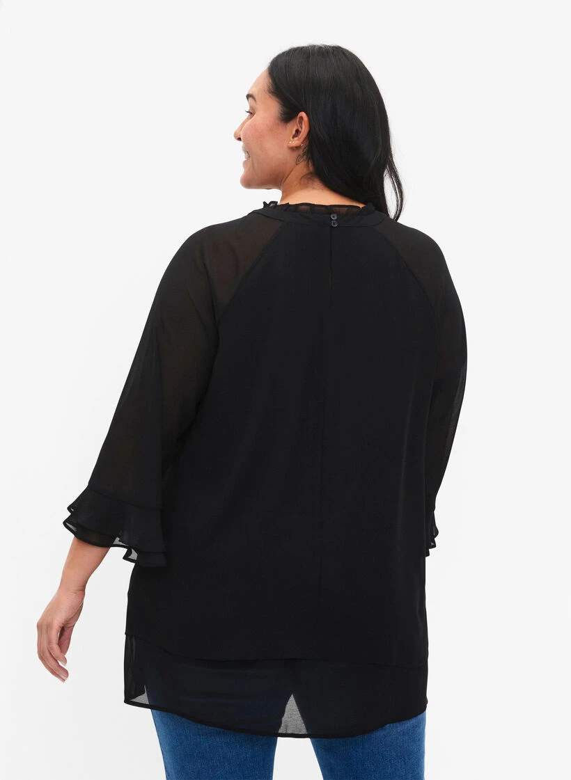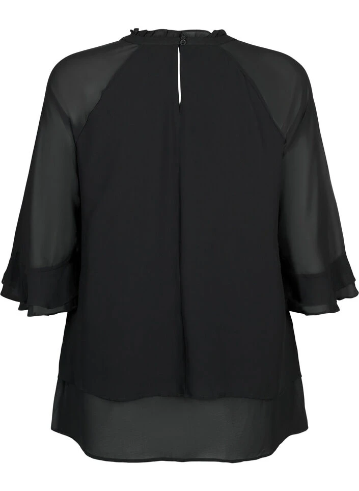 Super nice blouse with ruffle collar and light draping and keyhole fastening at the neck. The blouse has 3/4 long sleeves with double ruffle edge and a layered look with soft viscose lining and asymmetrical cuts at the bottom, which gives a nice fall.