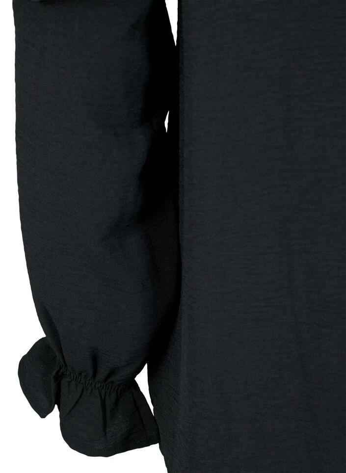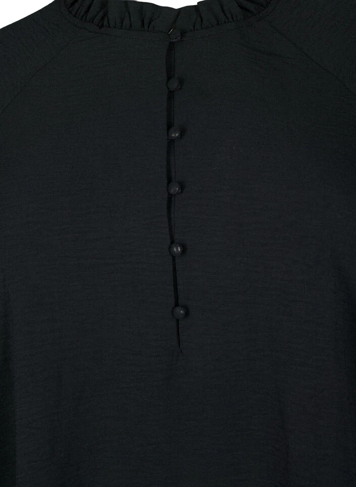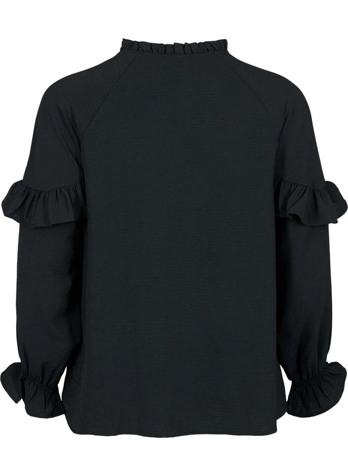 Feminine solid-colored blouse with long sleeves and a ruffled collar. The blouse has fabric buttons on the front and beautiful ruffle details, creating a feminine look.