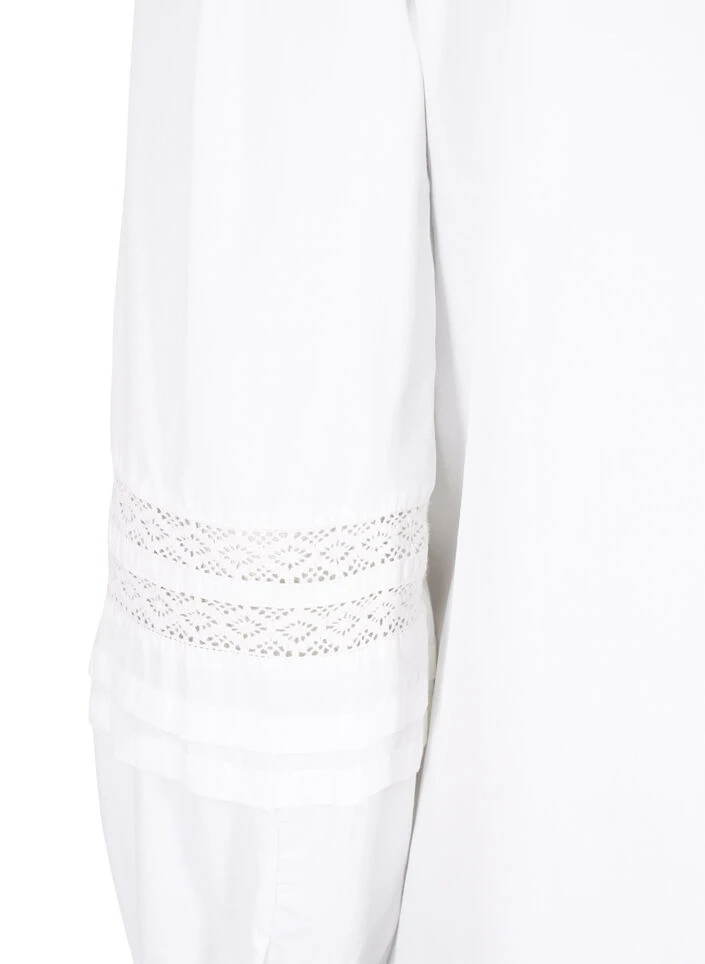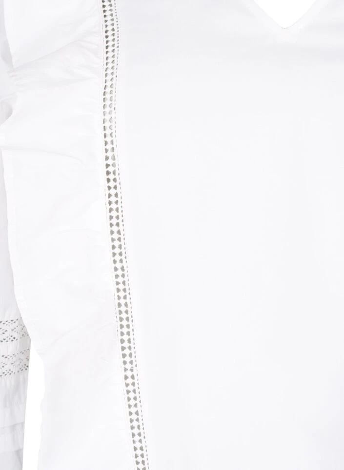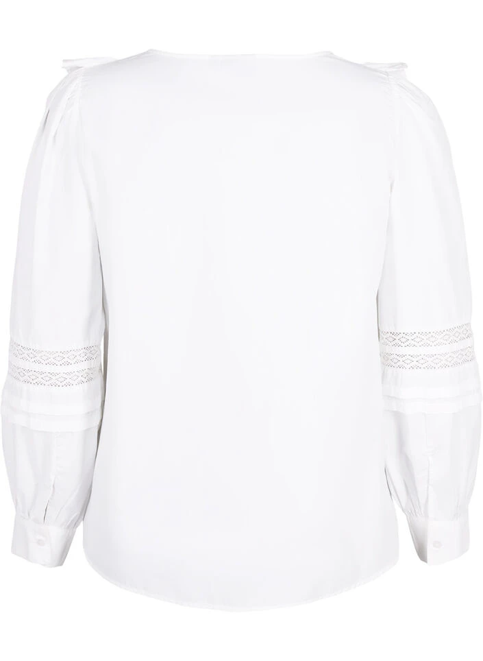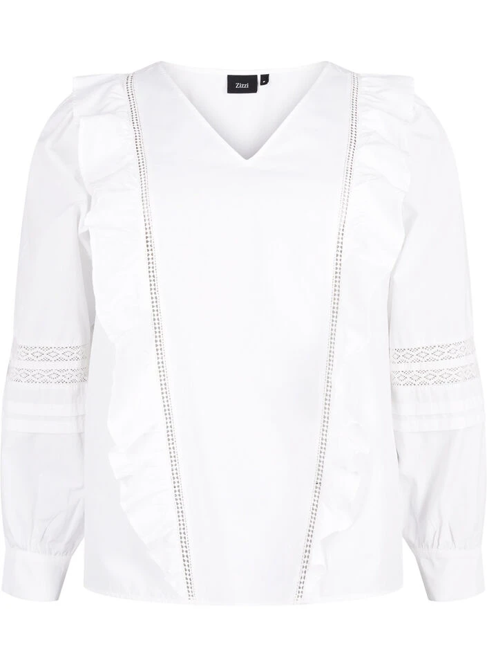 Long sleeve blouse with cuffed sleeves, V-neck and regular fit. The blouse is designed with ruffles and lace ribbons that add a feminine touch.
