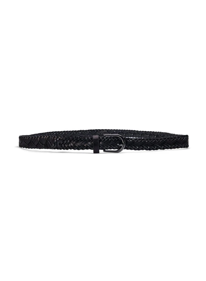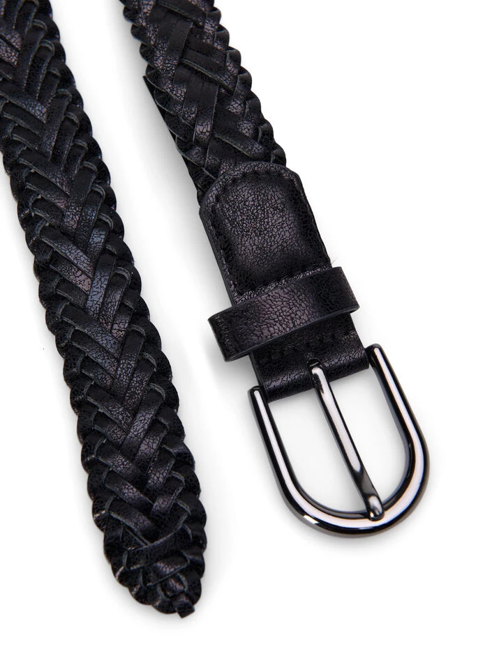 Braided belt in faux leather with silver buckle and beautiful metallic surface.