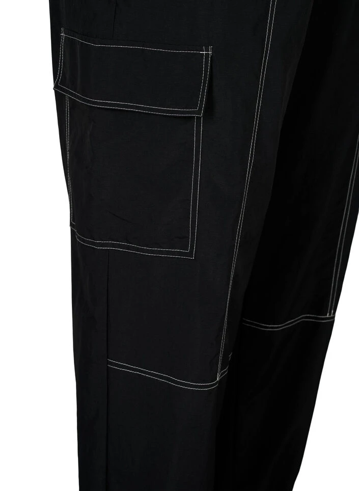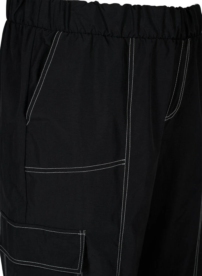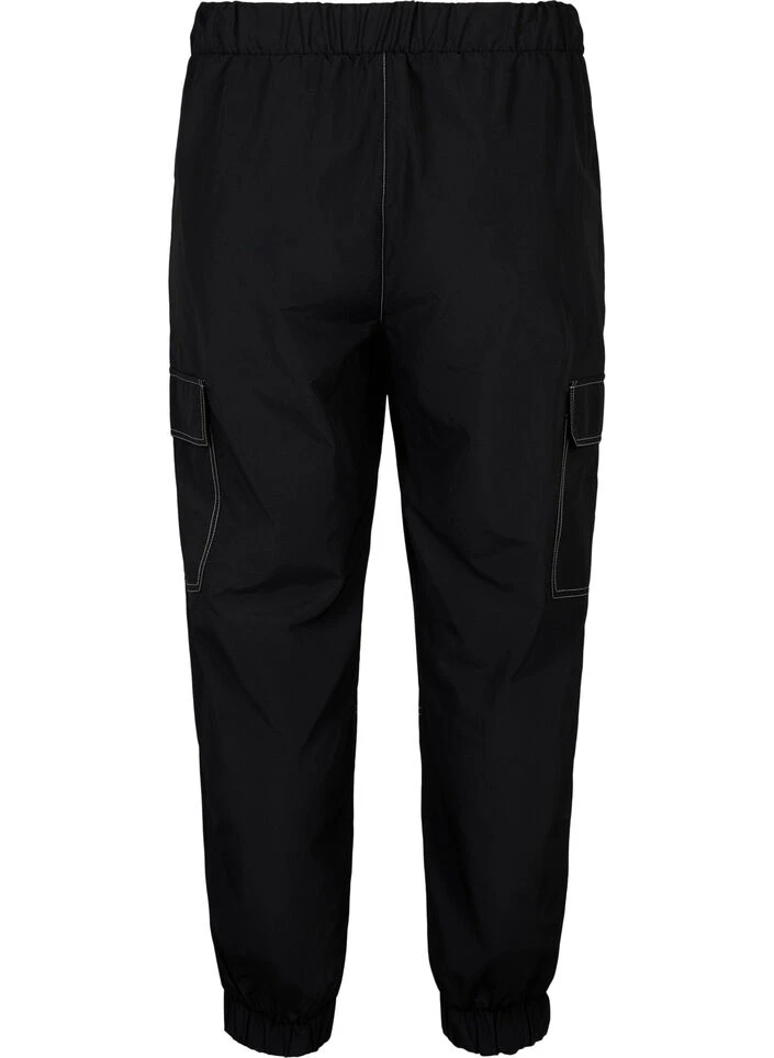 Trendy pants with cargo pockets and contrast stitching. The pants are made from a stretchy lightweight material, with an elastic waist and a looser fit around the thighs, narrower towards the ankles and elastic cuffs.