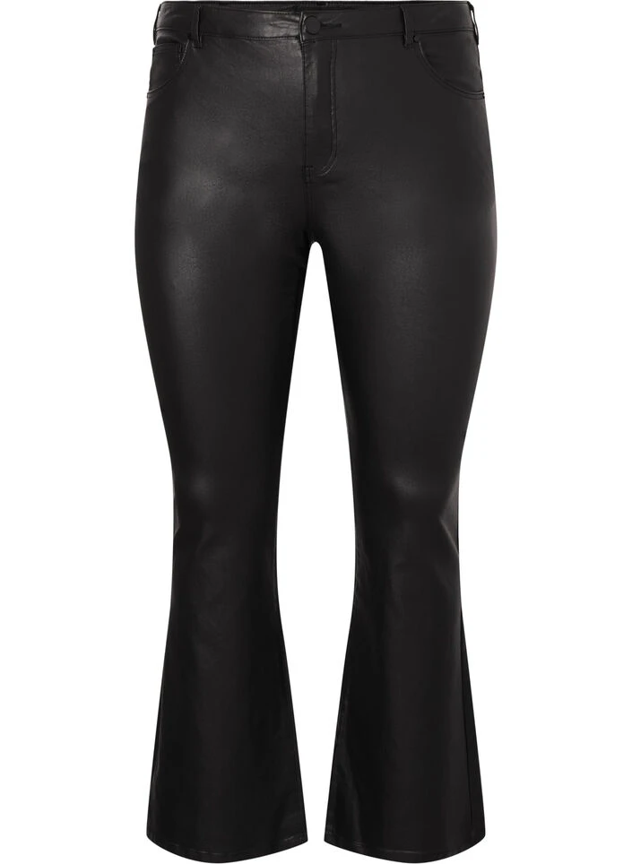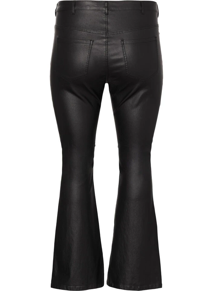 Bootcut jeans with high waist, classic pockets and belt loops. These jeans are coated and have a snug fit to the knee with extra width downwards, for a cool look.