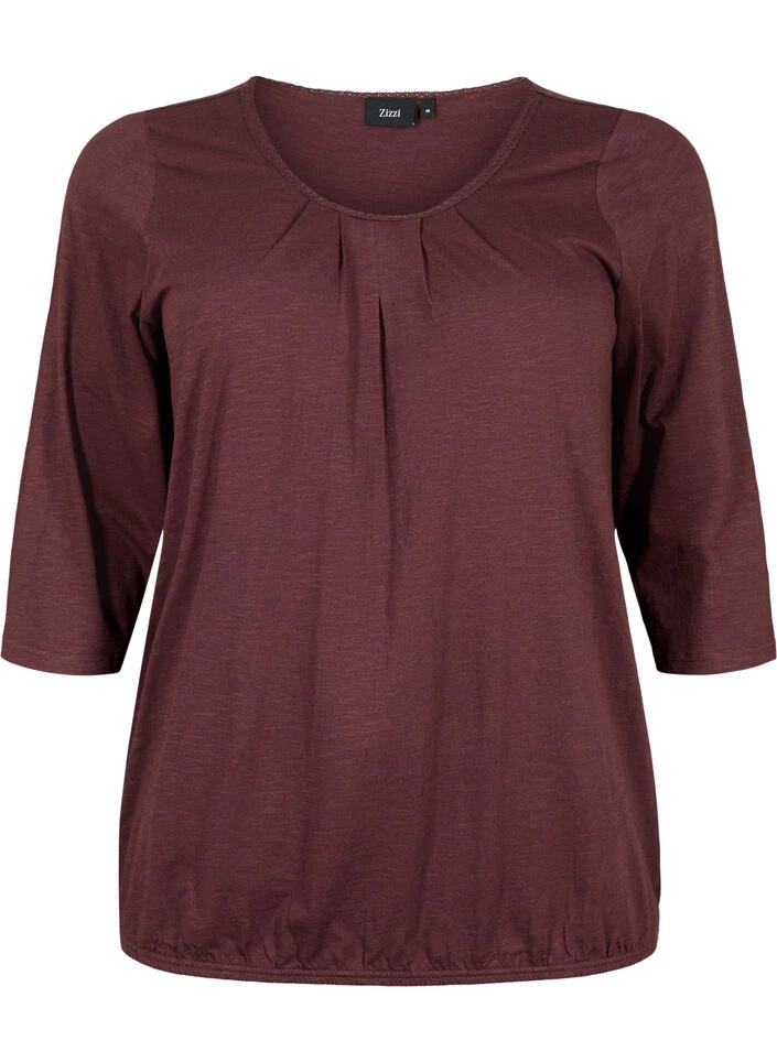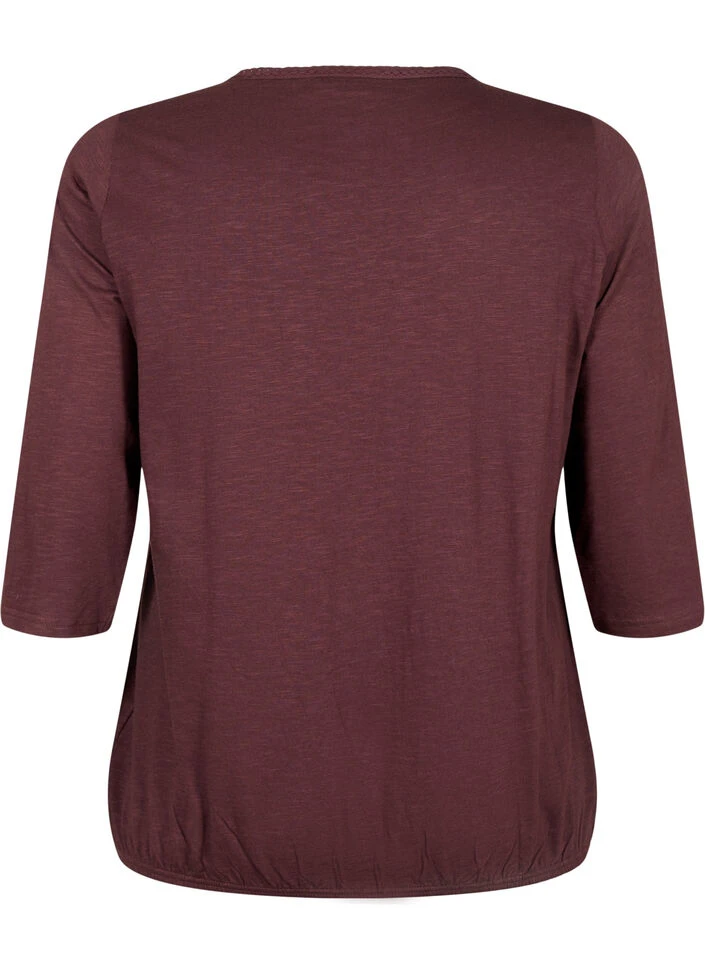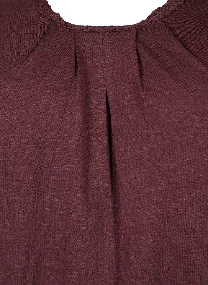 Plain color top in 100% cotton, which has 3/4 sleeves and a round neckline with lace trim and drapes.
