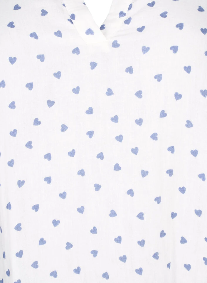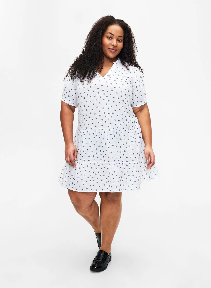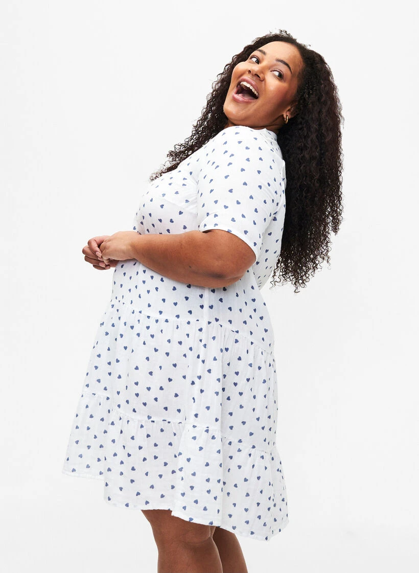 Beautiful all-over printed dress in a lovely muslin quality of 100% soft cotton. The dress has short sleeves, a v-neck and a cutline at the hem, which gives a slight drape and a feminine look.