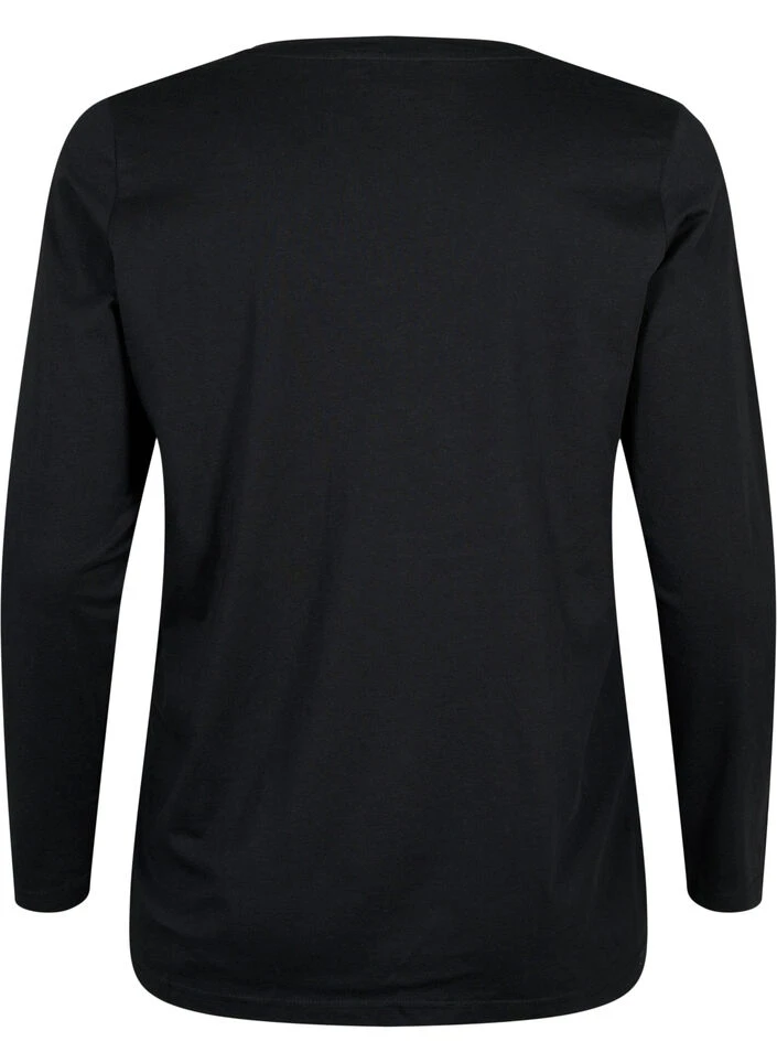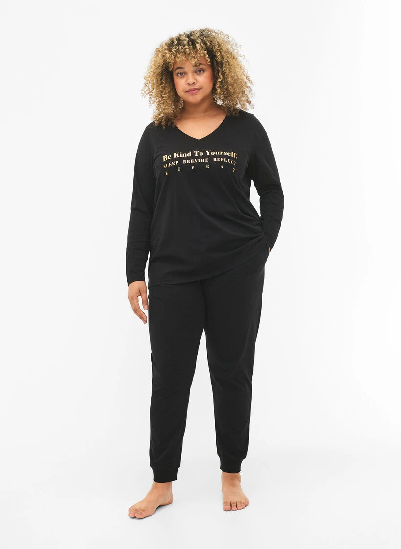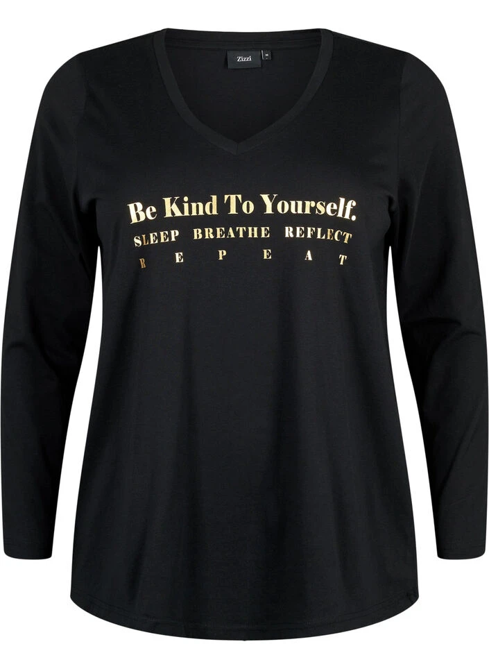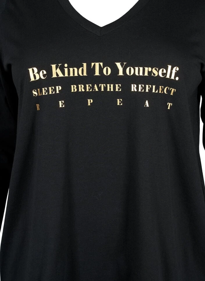 Long-sleeved night blouse in 100% cotton with a V-neckline and text print on breast.
