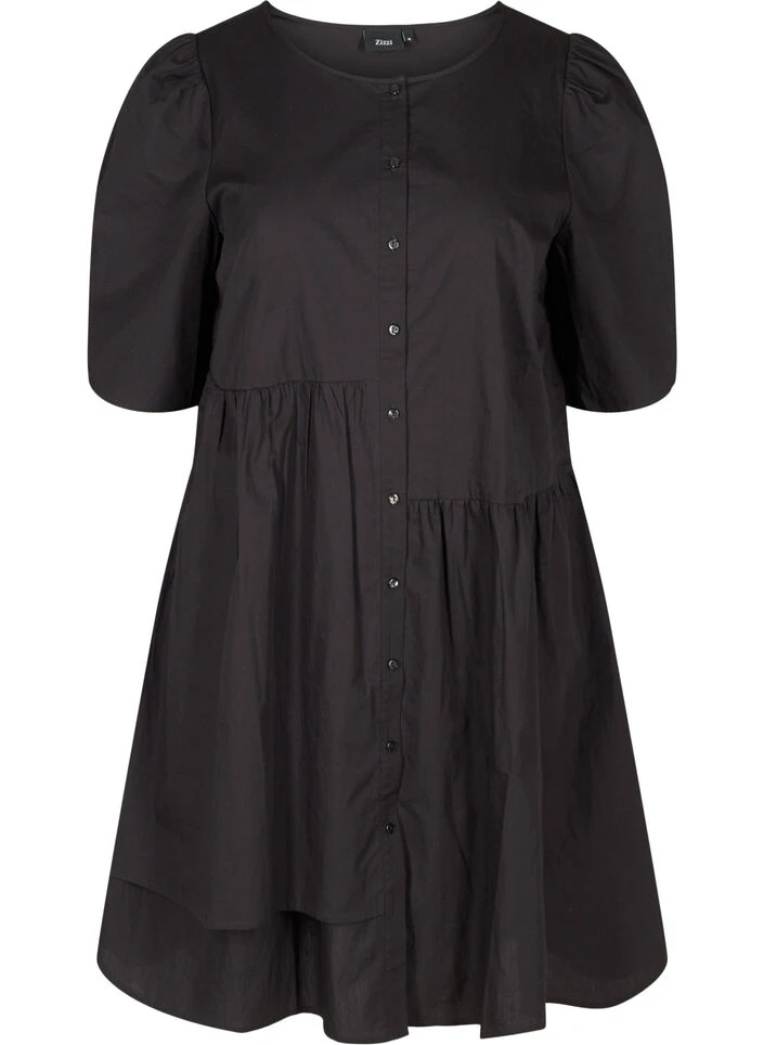 Feminine and solid-coloured shirt dress in 100% cotton that features a round neckline and buttons on the front. The dress has gorgeous 2/4-length puff sleeves and an asymmetrical cut at the waist, giving the loose A-line a lovely look.