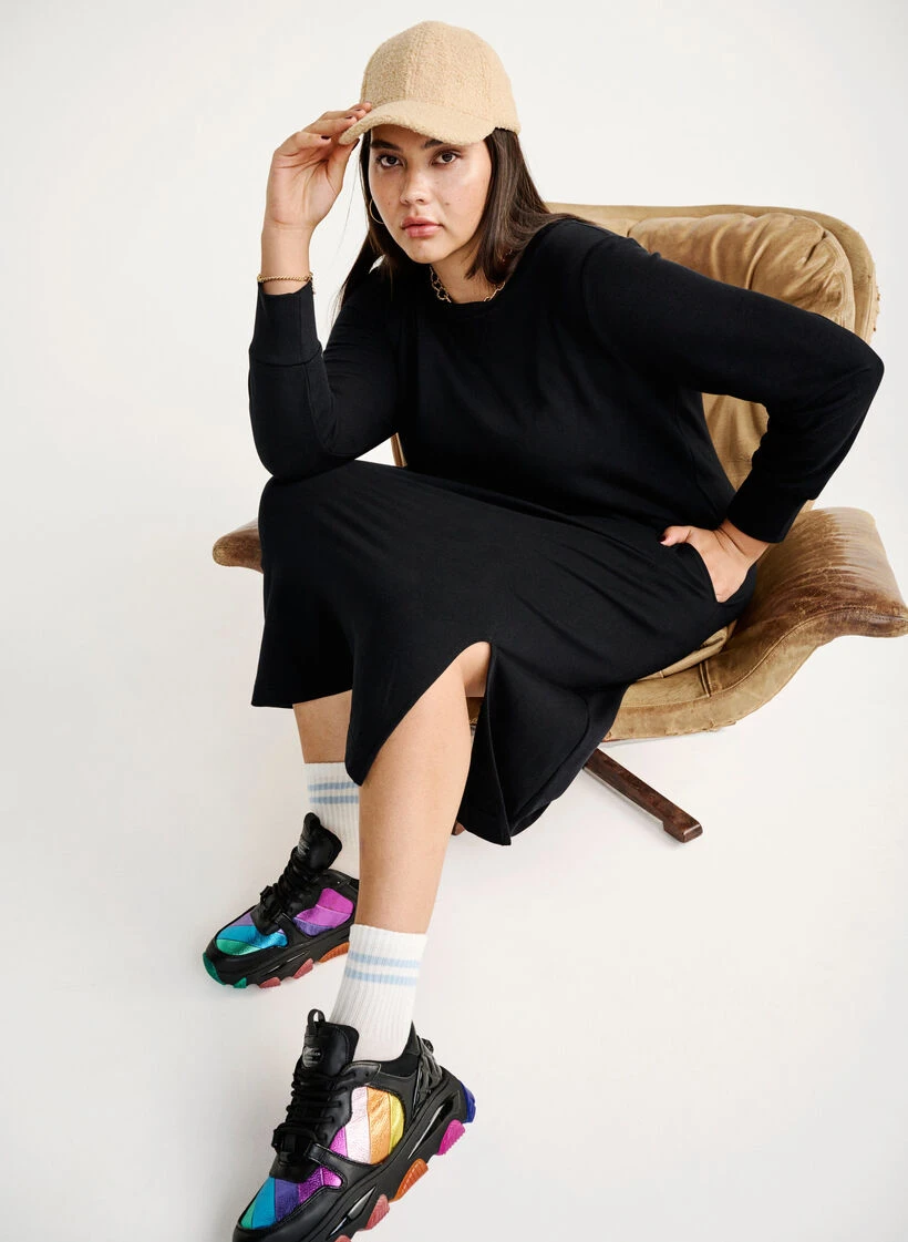 Comfortable sweater dress with slit and pockets in the side. The dress is made in a soft cotton blend with a loose fit and is finished with ribbing at the sleeves and bottom.