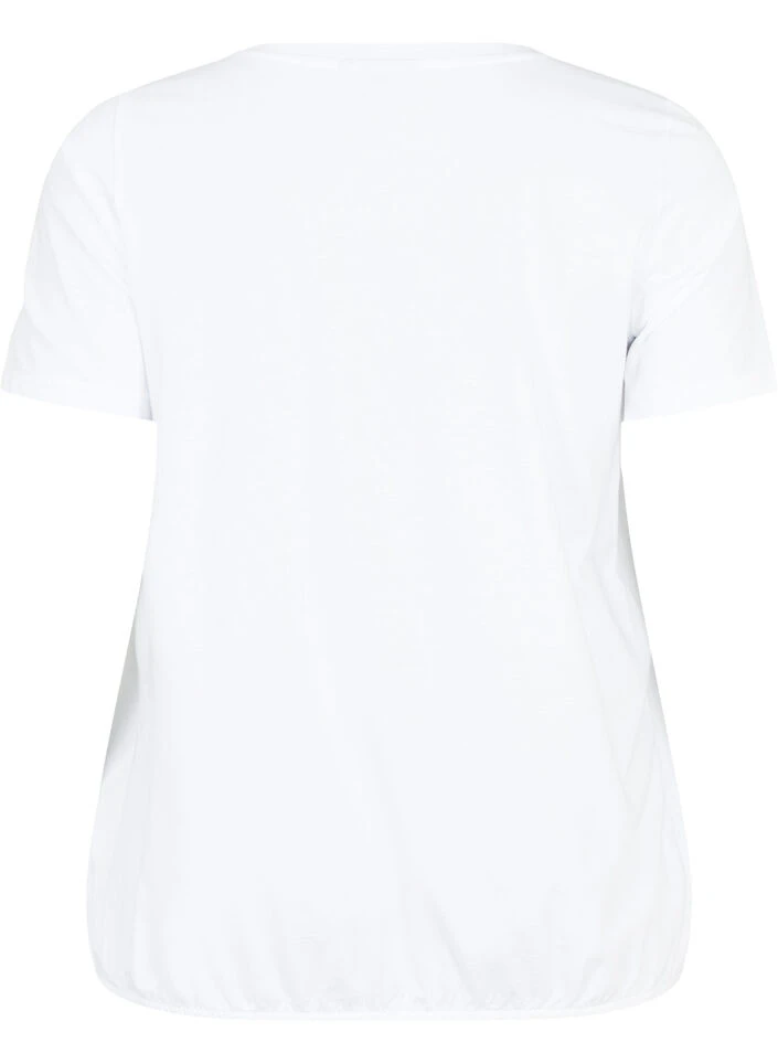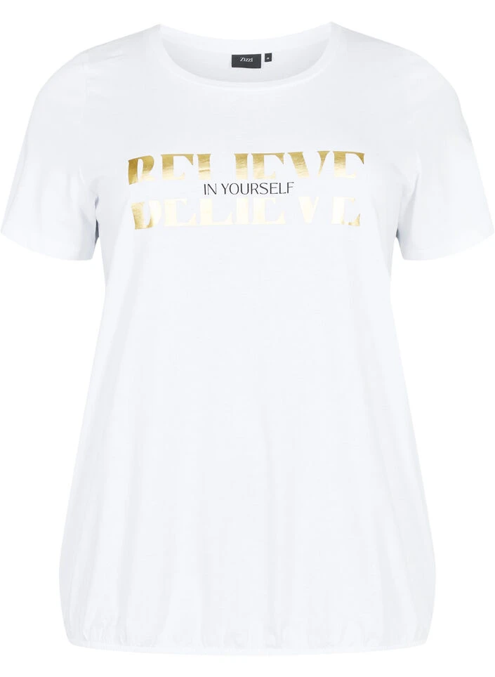 Short sleeve t-shirt in a soft cotton blend with 50% organic cotton and foil print on the chest. The t-shirt has a loose fit with an elasticated bottom hem that creates a beautiful balloon effect.