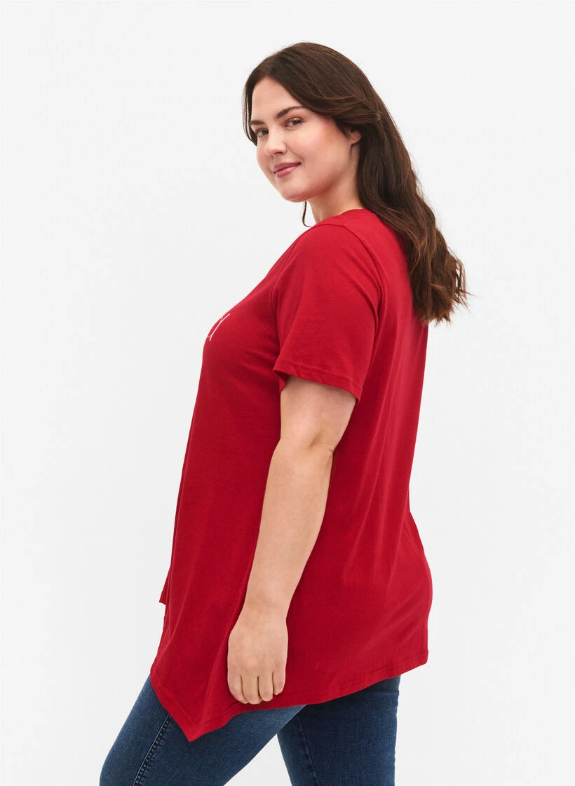 Short-sleeved t-shirt in a soft cotton of 50% organic cotton. The t-shirt has a v-neckline and a nice asymmetric bottom.