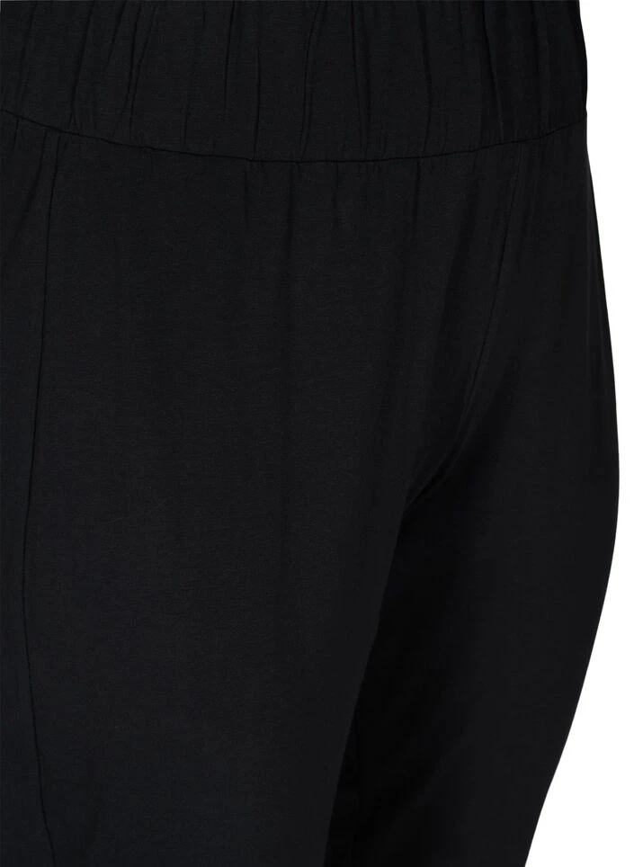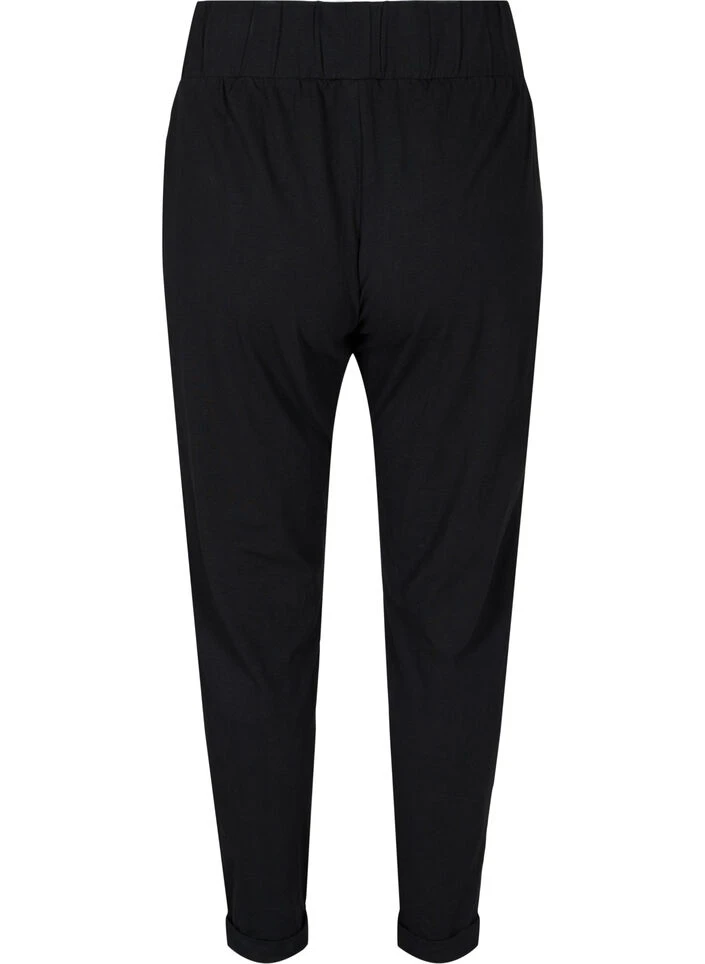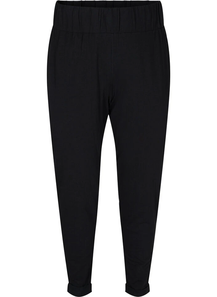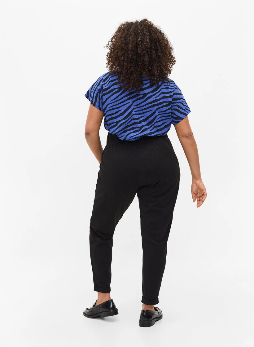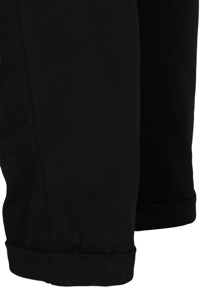 Simple trousers in a gorgeous cotton fabric. The trousers have an elasticated waist and turn-up cuffs on the ends of the legs.