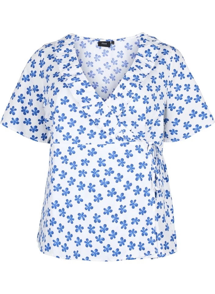 Cute short-sleeved blouse with a wrap design and a beautiful printed pattern, made in 100% cotton. The blouse has short sleeves, a V-neckline with ruffle details and ties at the waist with a tie.