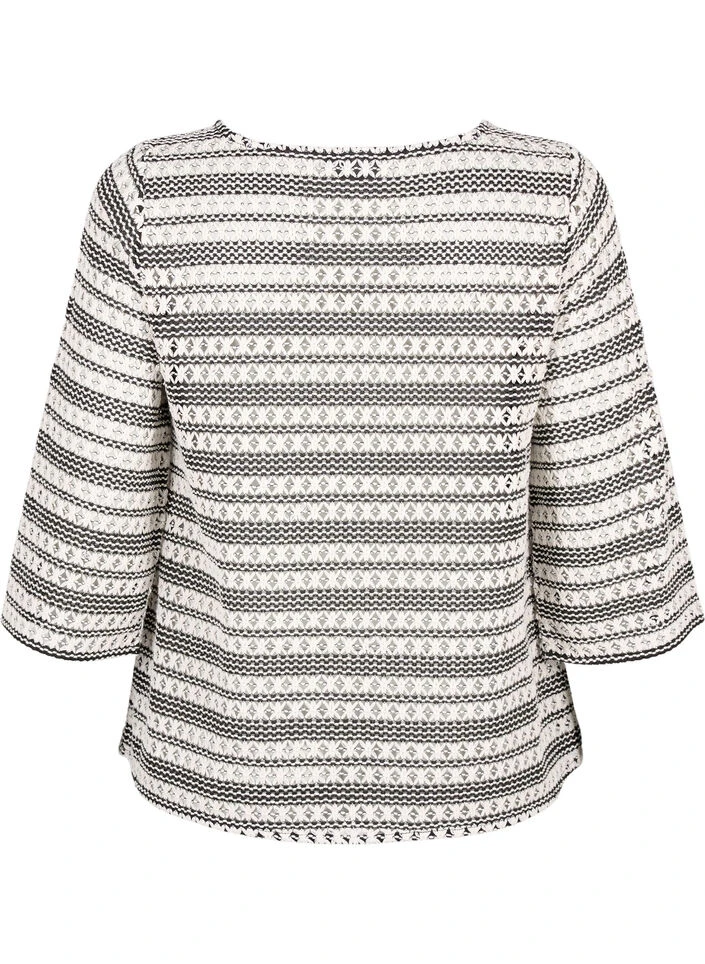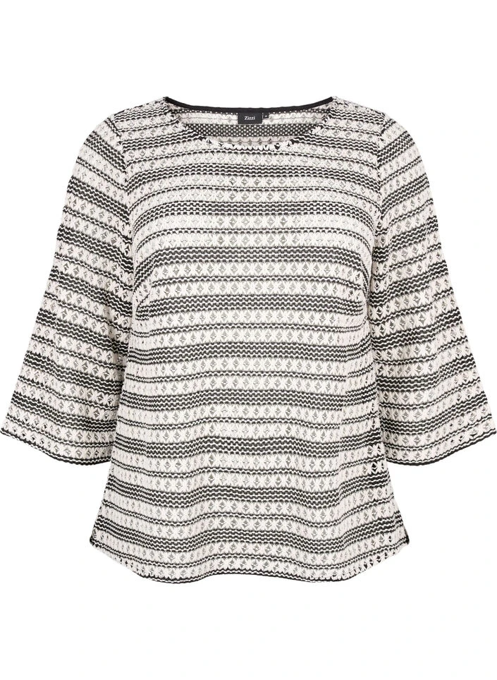 Soft transparent blouse with a nice and decorative crochet pattern. The blouse has 3/4 sleeves, a round neck and a regular fit.