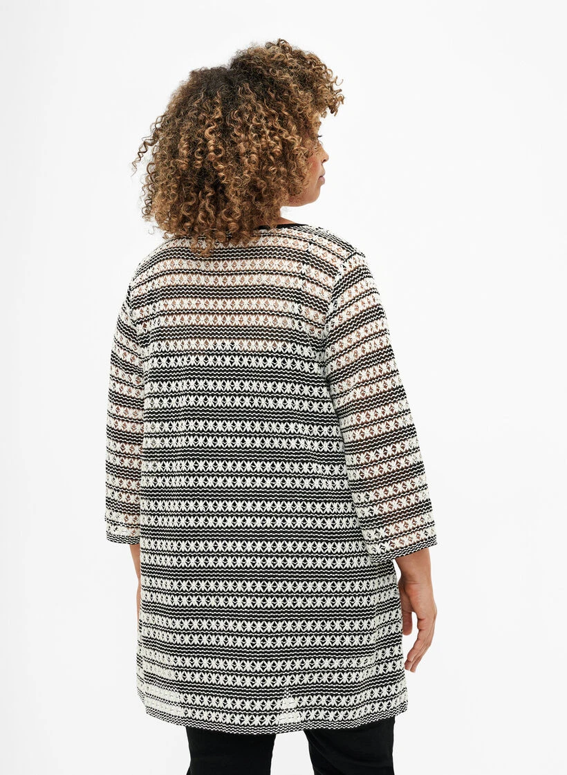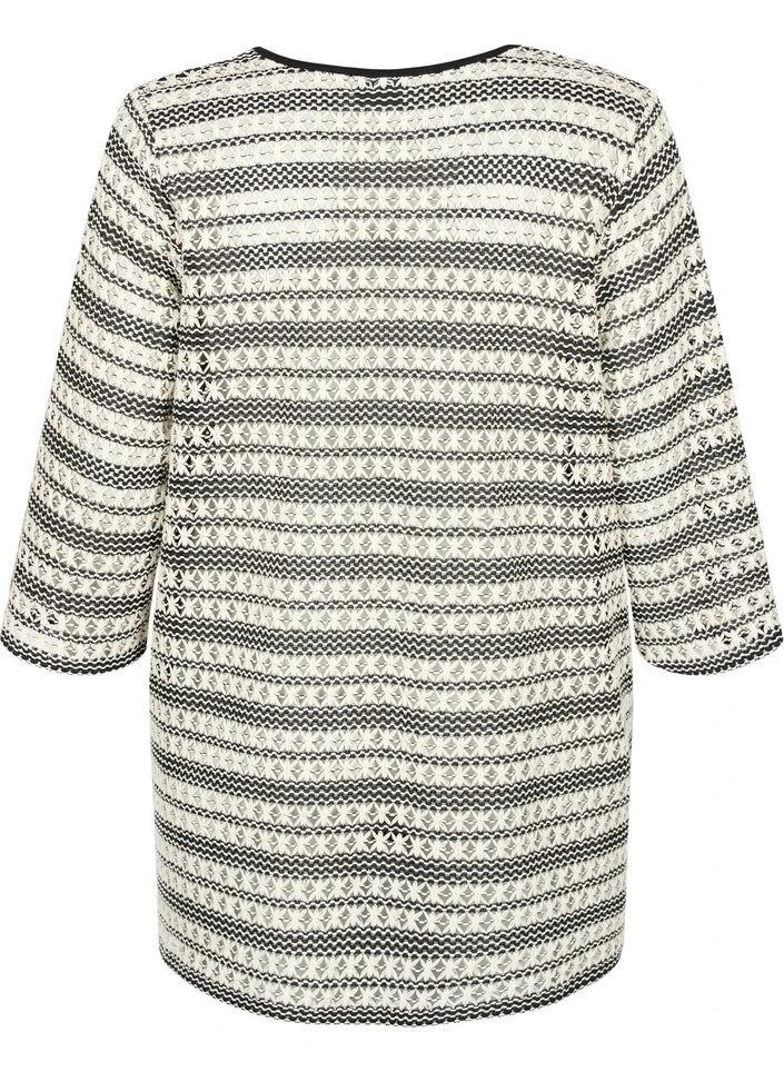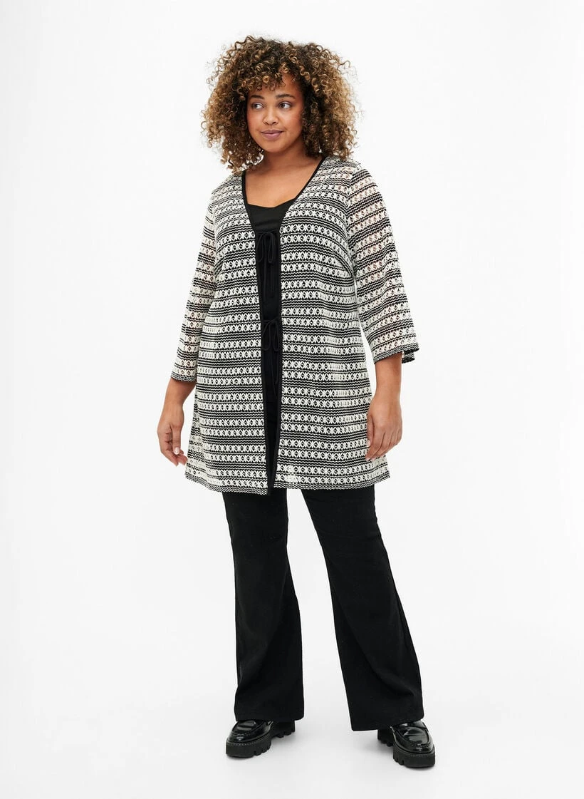Cardigan with decorative crochet pattern and 3/4 sleeves. This cardigan is designed with a V-neckline and a fine tie detail at the front.
