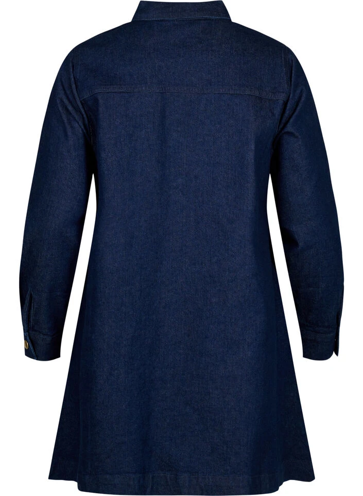 Long sleeve denim dress with shirt collar, chest pockets and short placket with golden buttons. The dress is designed with a loose-fitting A-line cut and made from a cotton fabric with a little stretch.