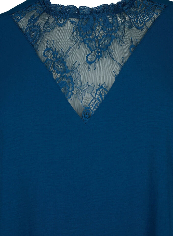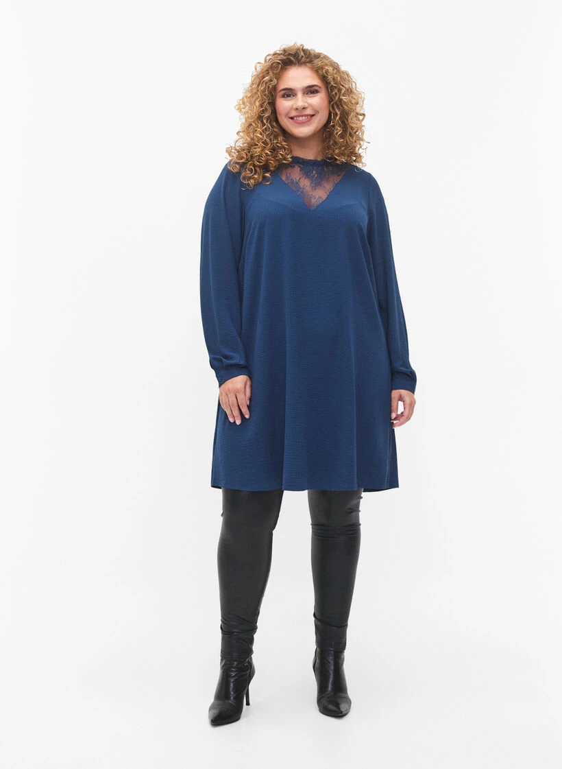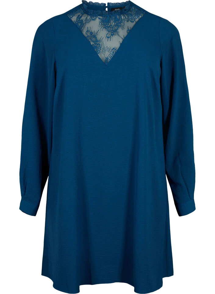 A beautiful plain dress with long sleeves with button fastening and feminine lace details at the neck. The dress has a loose A-shape and is made in a soft fabric with recycled polyester.