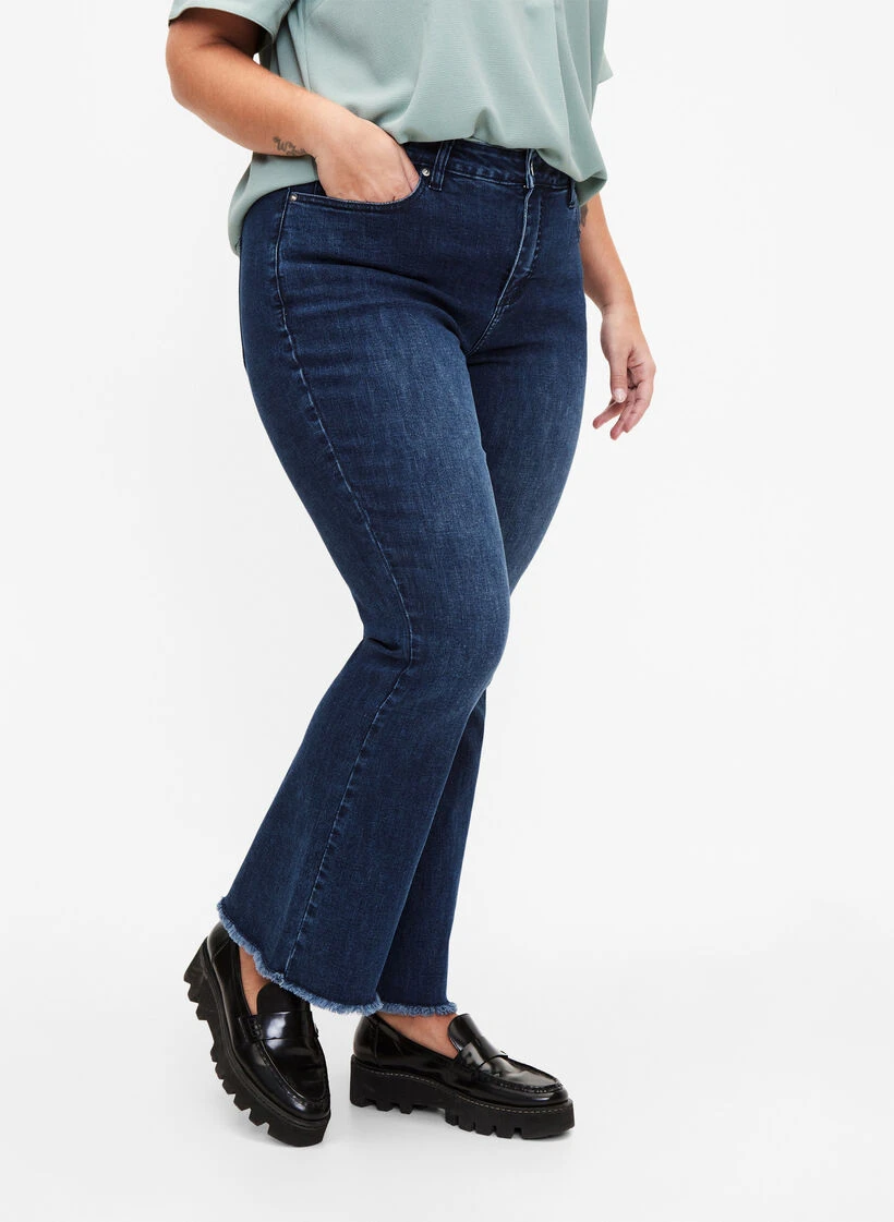 Cropped jeans with a high waist, bootcut and a raw hem. Designed with classic pockets and belt loops, these jeans are made from a comfortable material mix of cotton and recycled polyester.