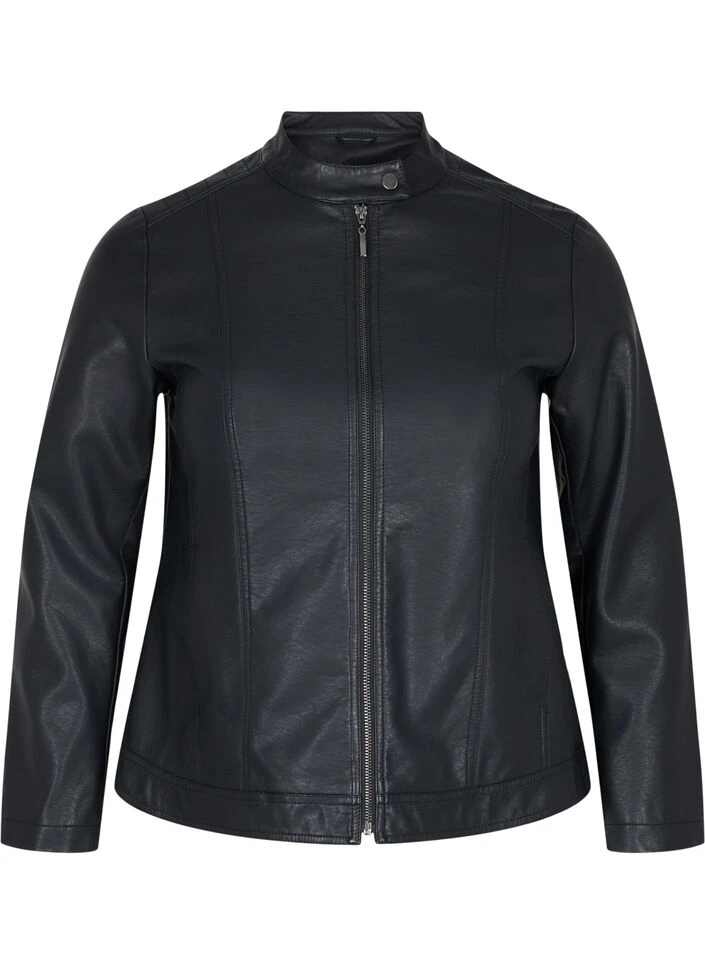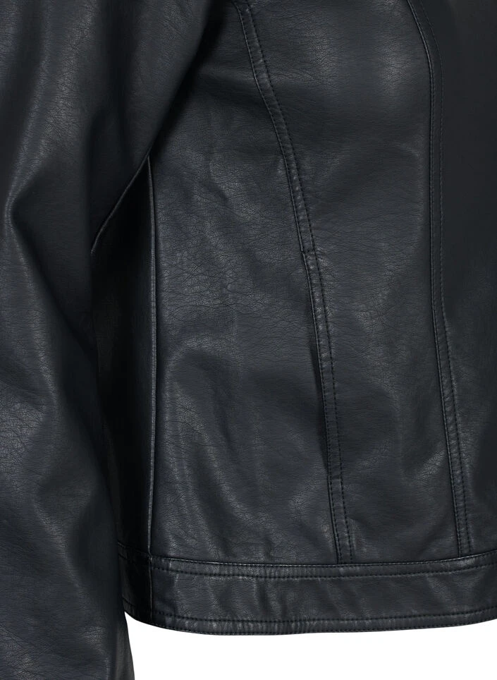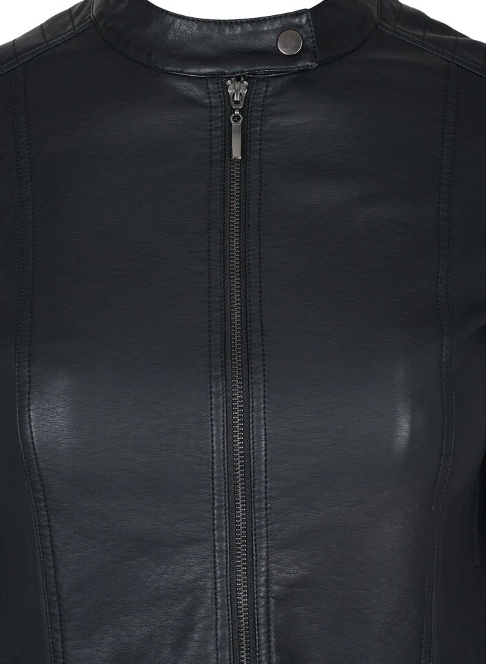 Cool jacket in imitation leather in a simple design. The jacket has pockets in the sides and is closed at the front with a zipper, as well as buttoned at the neck with a button.