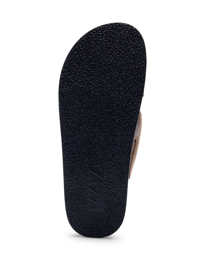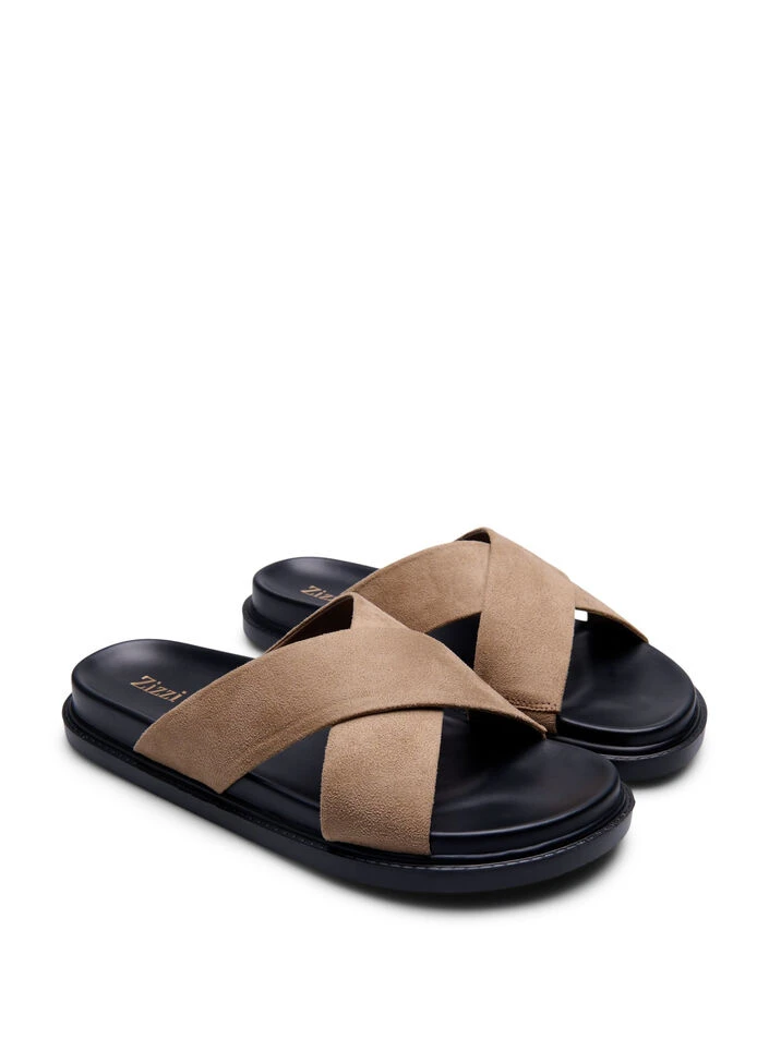 Faux suede sandal with a wide fit. The sandal is designed with wide crossed straps and elastic panels on the inside, ensuring a flexible fit that adapts to your foot for optimal comfort and support.