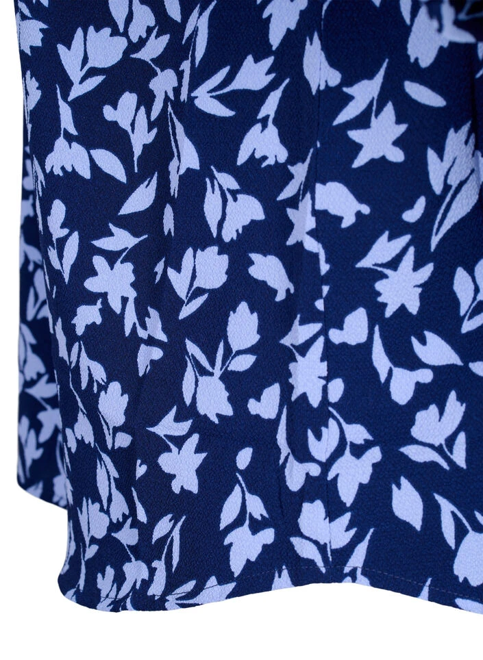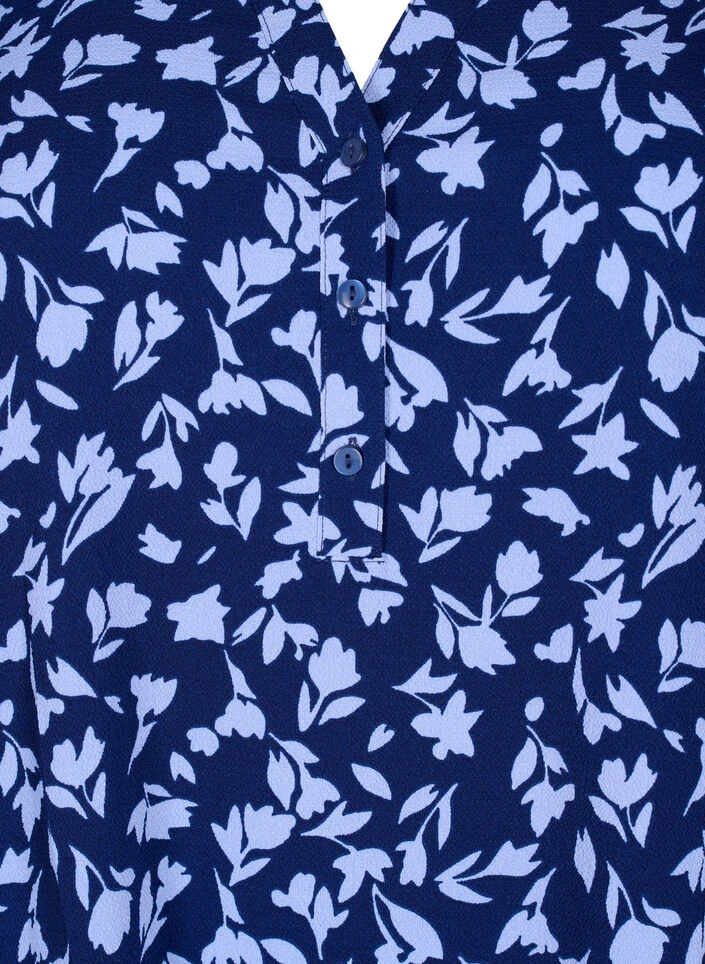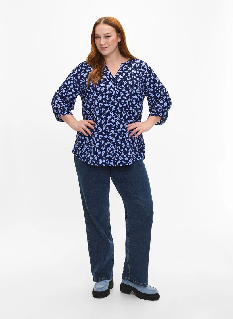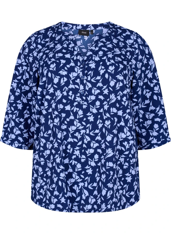 Blouse made with 55% recycled polyester and a nice all-over print. The blouse has 3/4 sleeves and a small V-neck with button closure at the front.