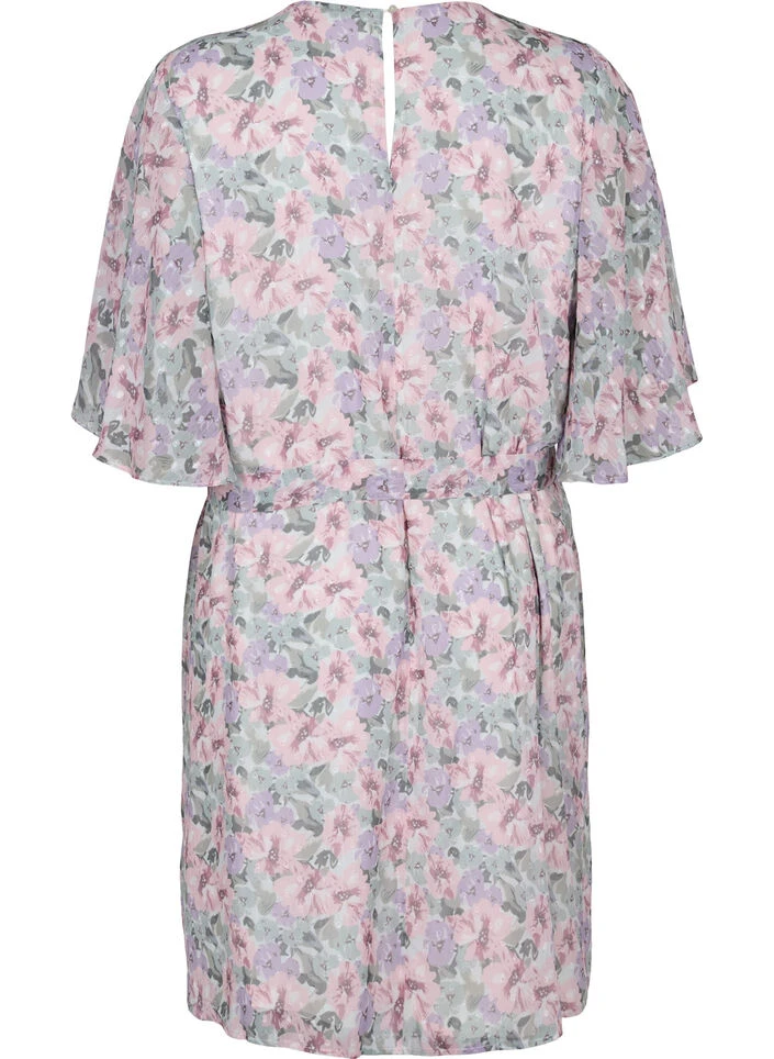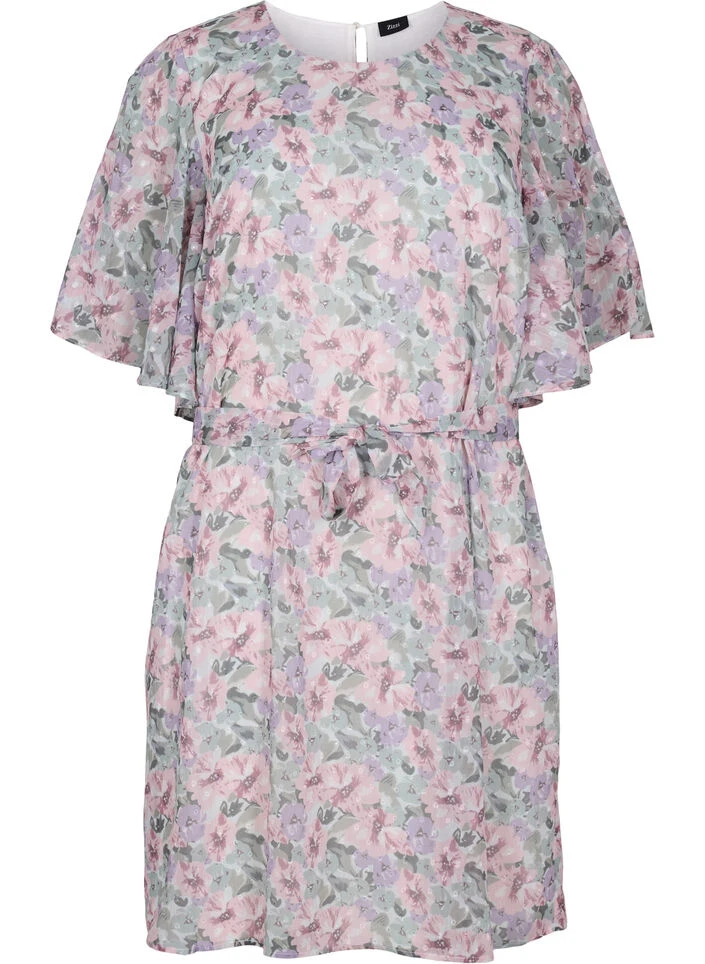 Feminine all-over floral dress with tie band at the waist, which emphasizes a feminine silhouette. It has a round neckline with button closure at the neck and short sleeves with width and slit. The dress has a soft viscose lining.