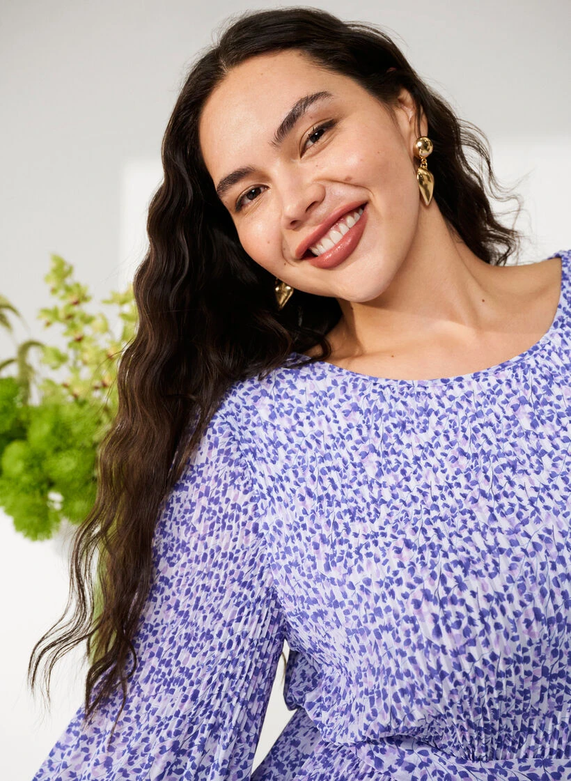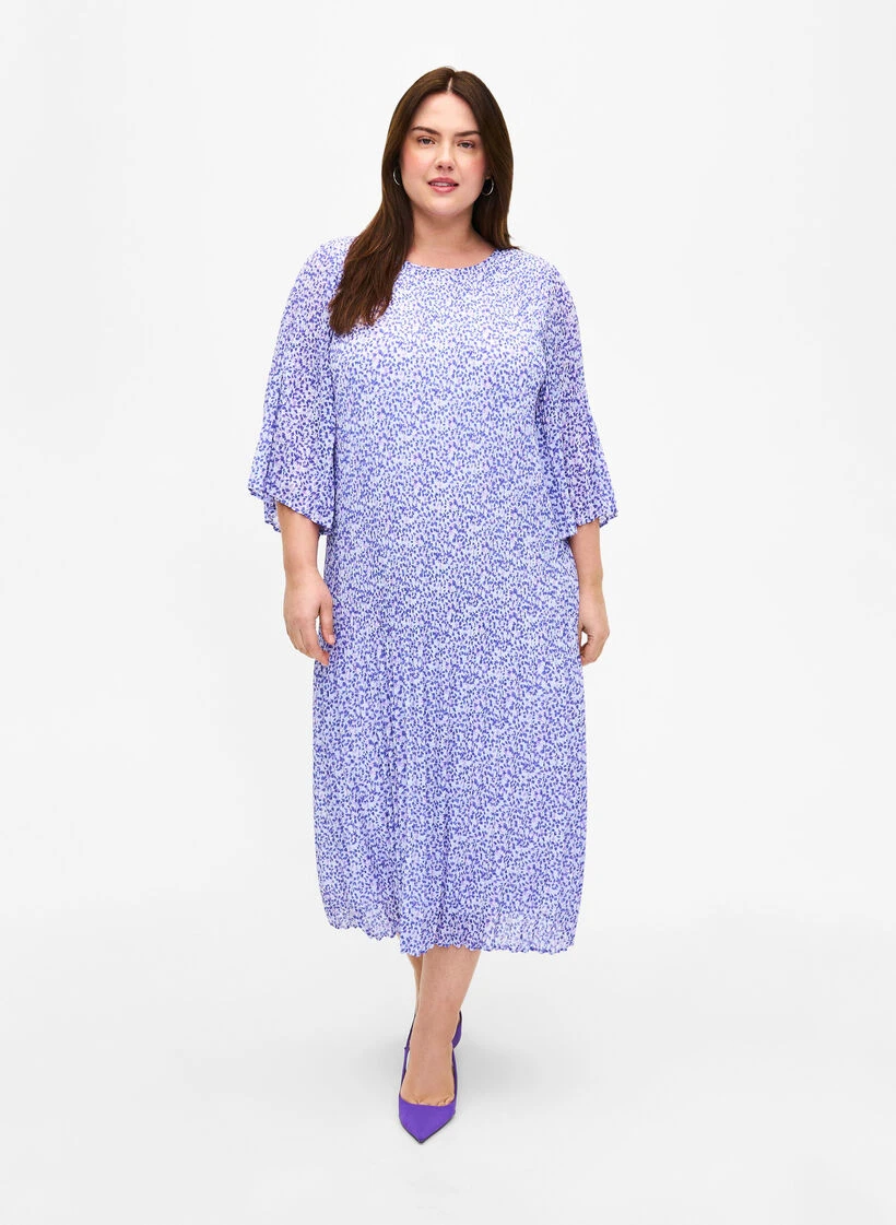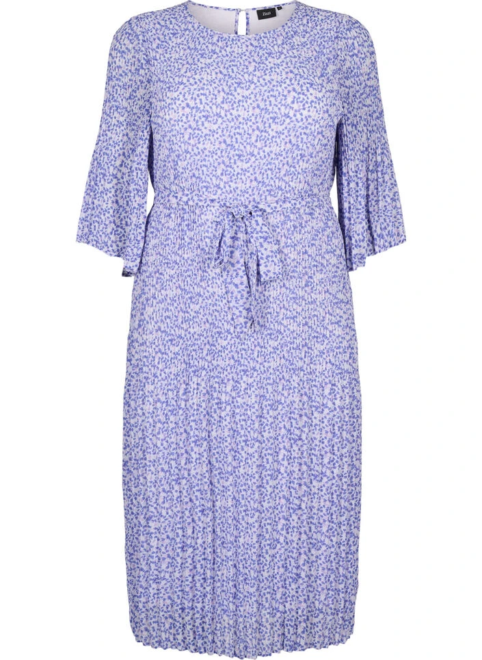 Elegant pleated dress with a delicate floral print, and lined with soft viscose on the inside. The dress has a round neckline with a keyhole closure at the neck, 3/4 sleeves with a wide hem, and a matching drawstring at the waist to create a beautiful silhouette.