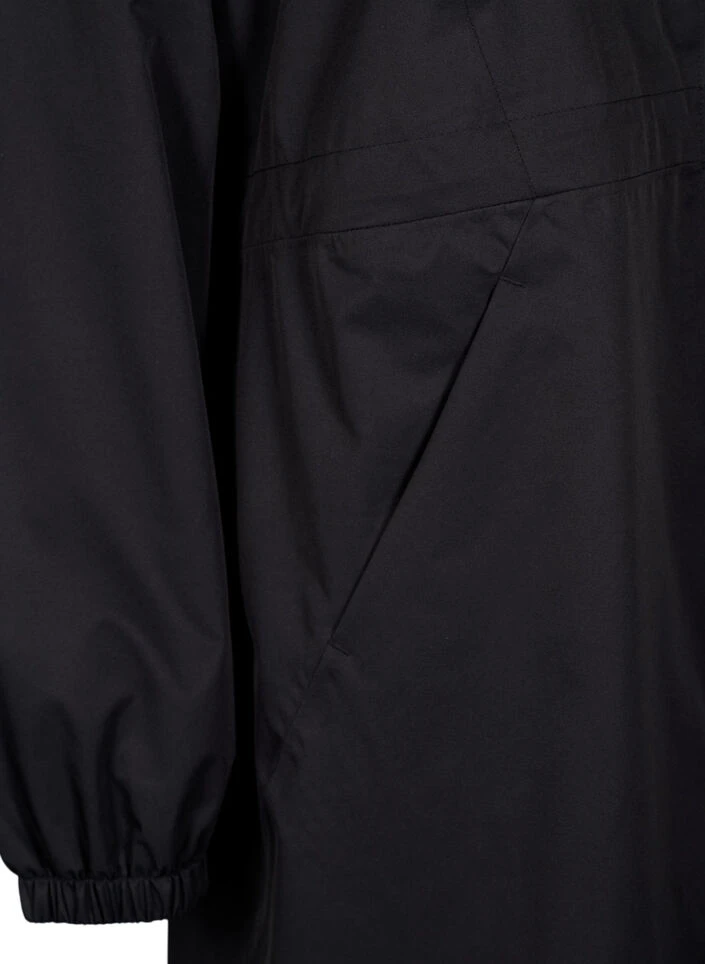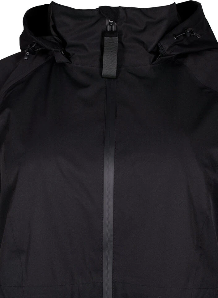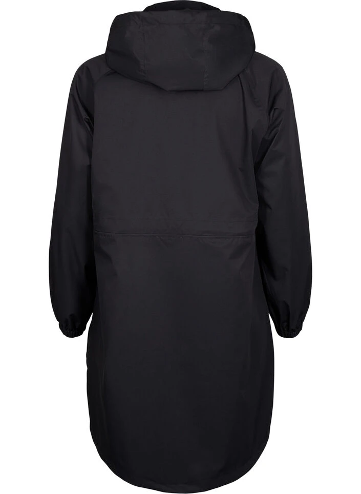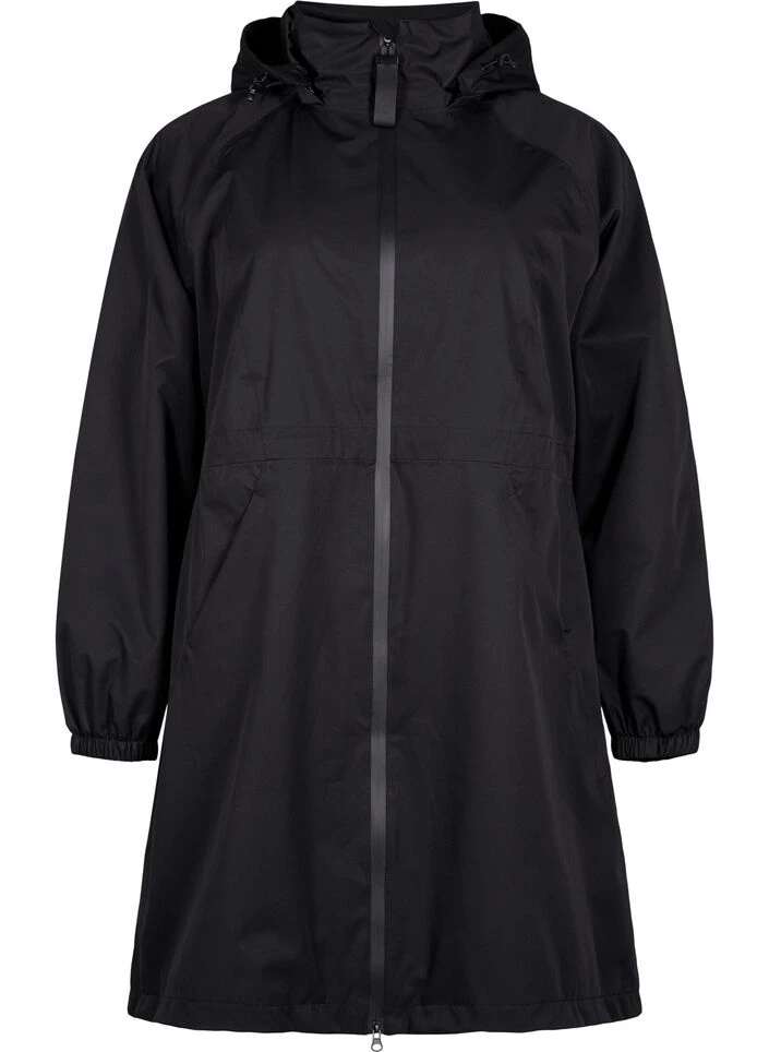 Functional coat with a waterproof two-way zipper, zippered side pockets and elastic sleeve ends that prevent wind from entering. The coat features inner adjustable elastic at the waist and on the detachable hood.
