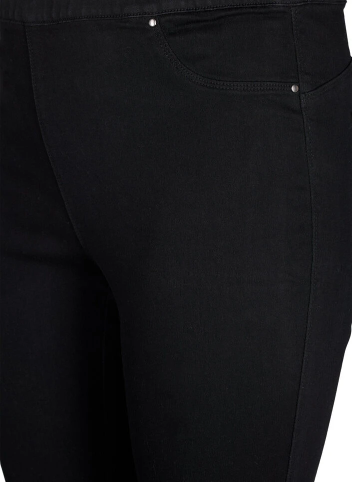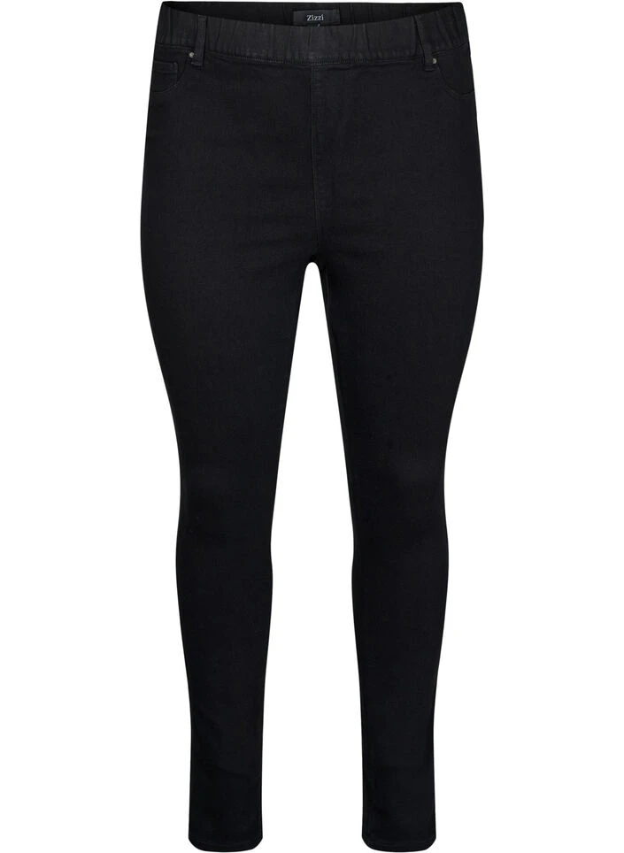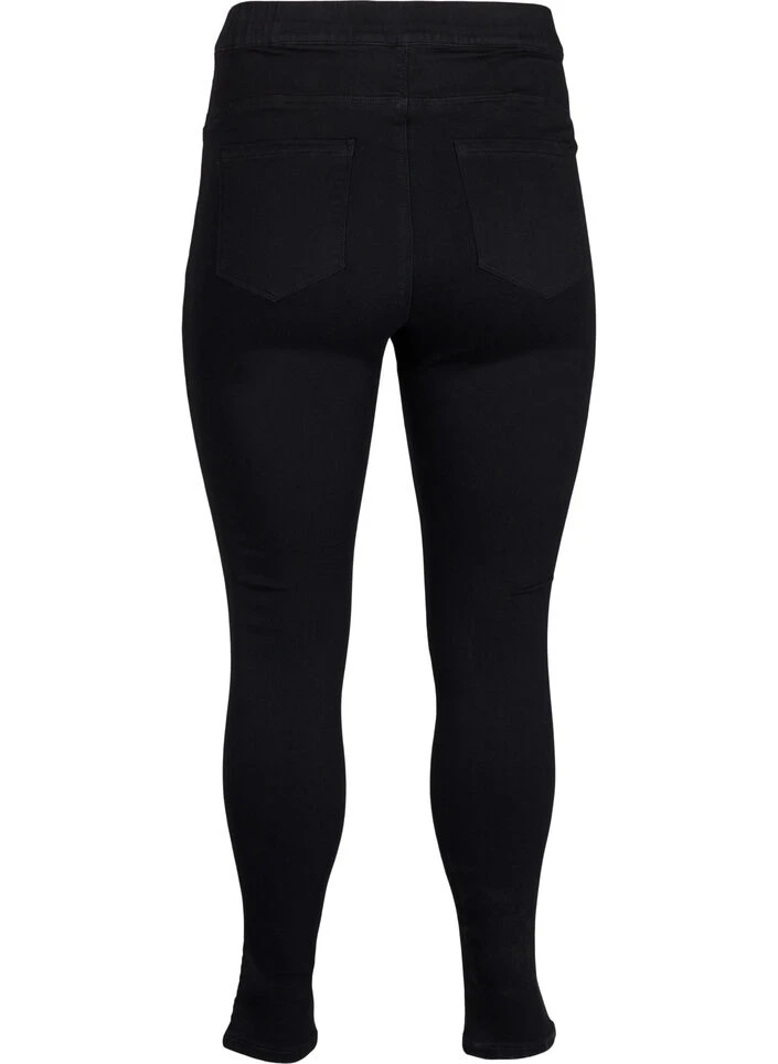 High waist jeggings in a simple design with back pockets and decorative front pockets without a functional pocket lining. These jeggings are made from a stretchy cotton blend with an elastic waistband.