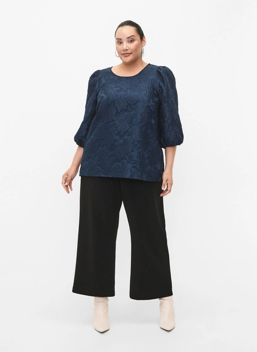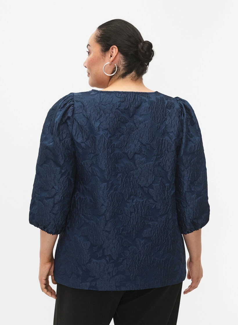 Beautiful blouse in an nice jacquard fabric with regular fit. The blouse has a round neck, small pleats on the shoulders and 3/4 sleeves with elastic cuffs to create a pretty puff sleeve.