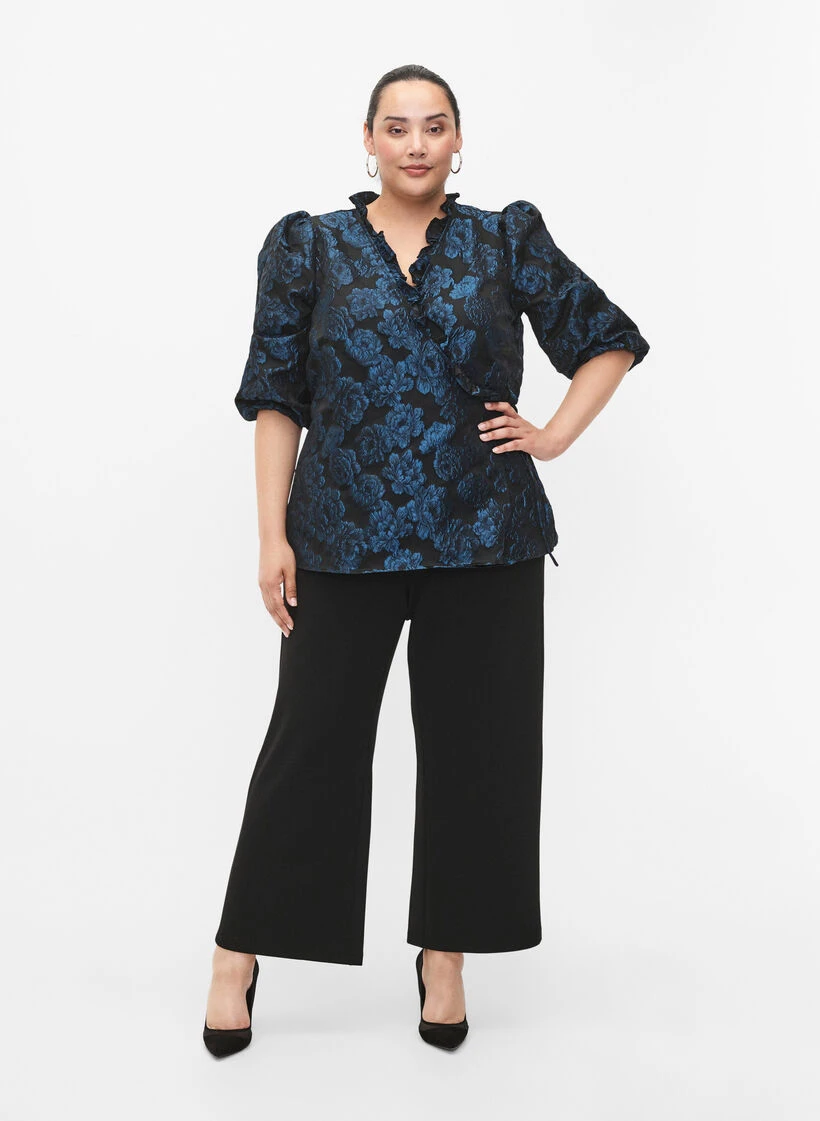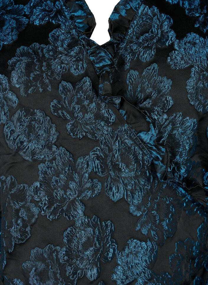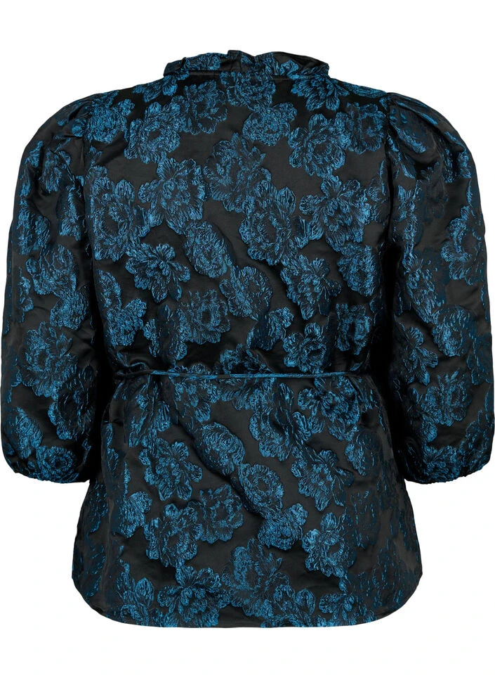 Elegant blouse in a beautiful jacquard fabric with a wrap design. The blouse has a v-neckline with ruffle edge, 3/4 sleeves with elastic edge and small pleats on the shoulders to create attractive puff sleeves, with fixed tie strings at the side.