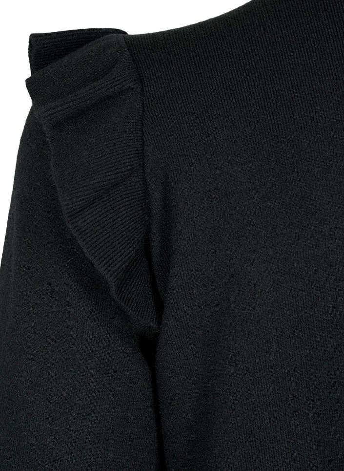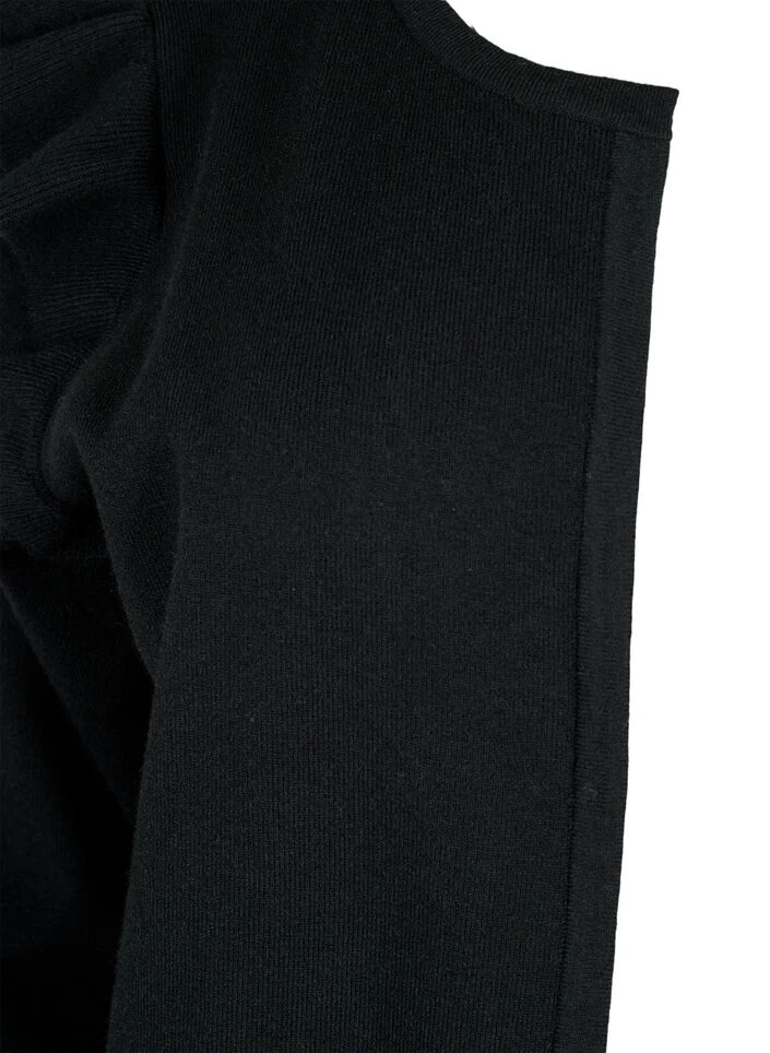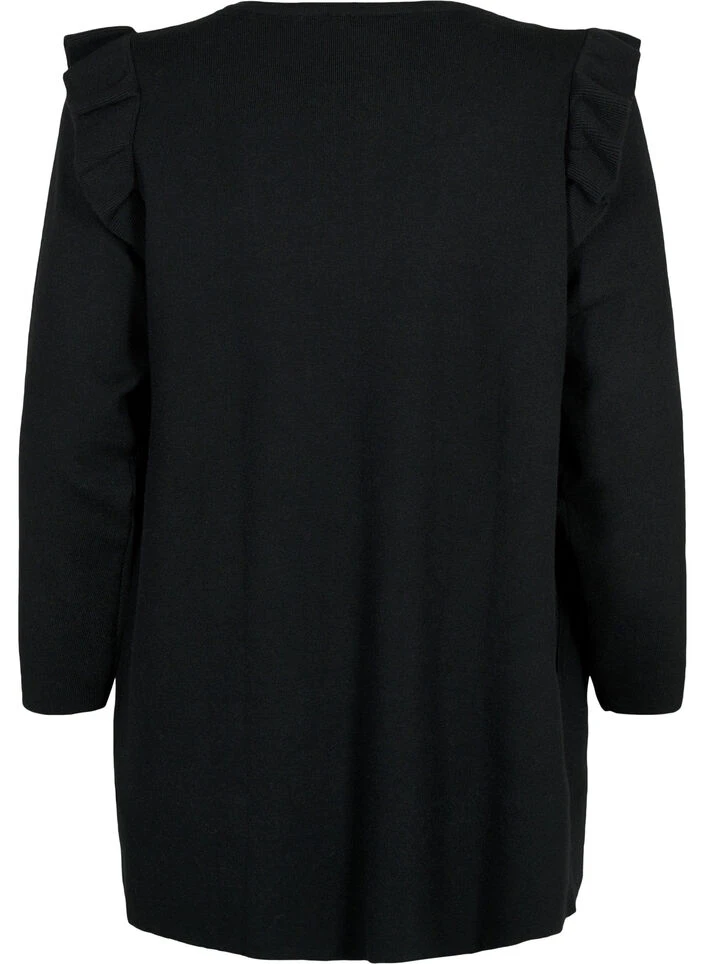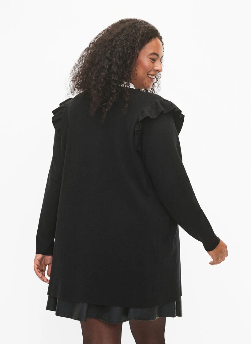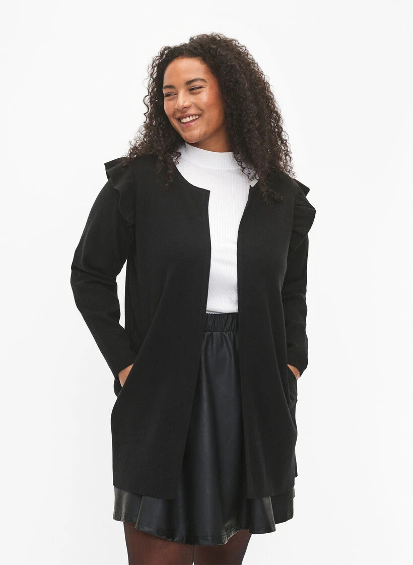 Feminine knitted cardigan in a quality with viscose and beautiful ruffle details on the shoulders. The cardigan has a loose and open fit with side pockets.