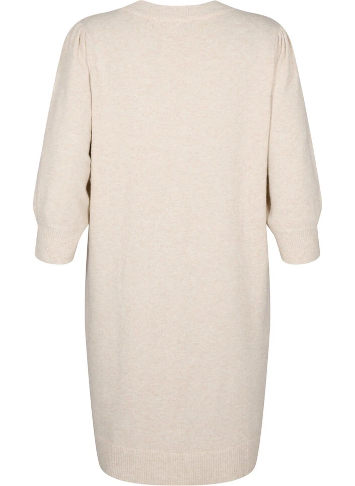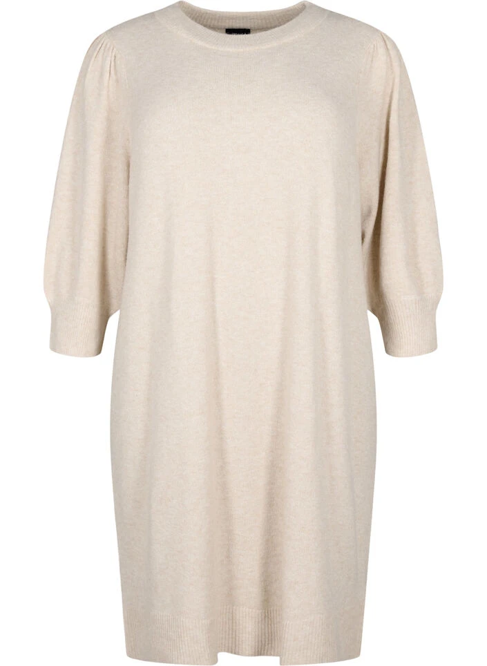 Melange knitted dress with fine puff sleeves in 3/4 length. The dress has wide ribbing on the sleeves and bottom and is made from 94% recycled polyester.