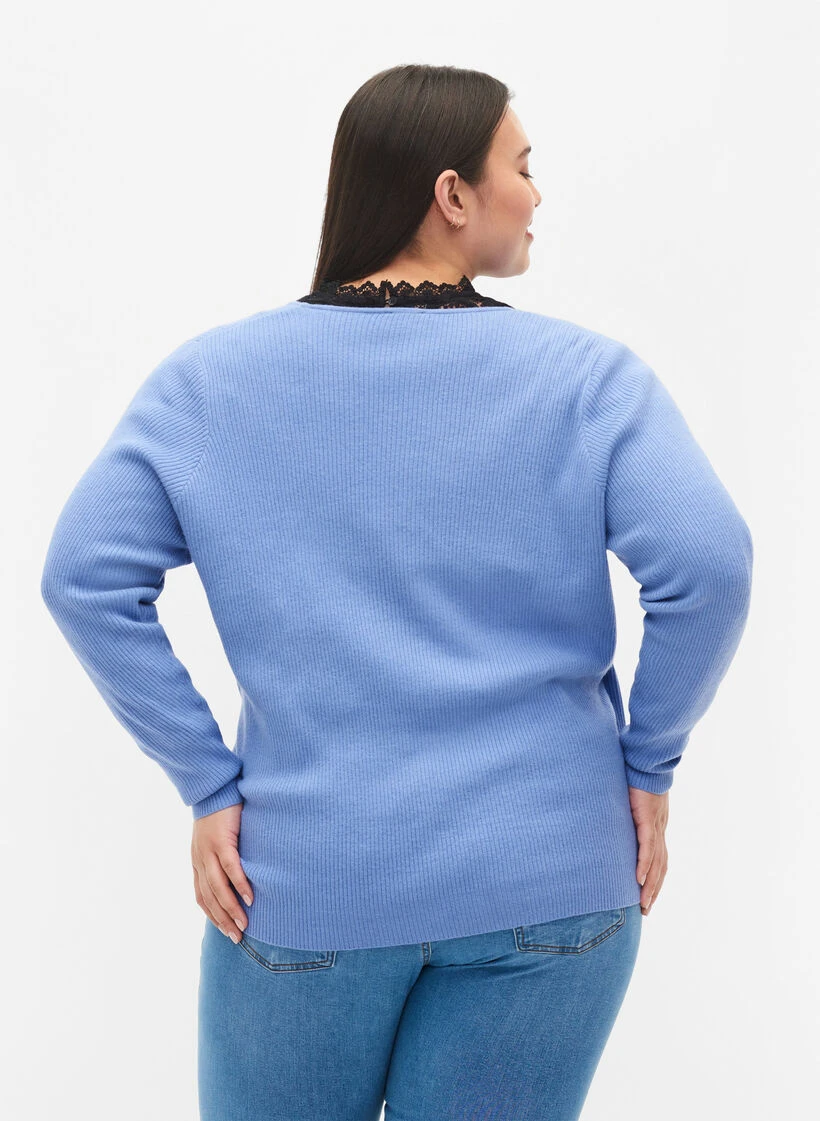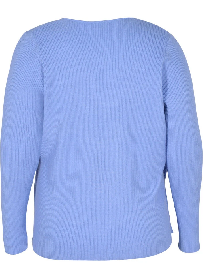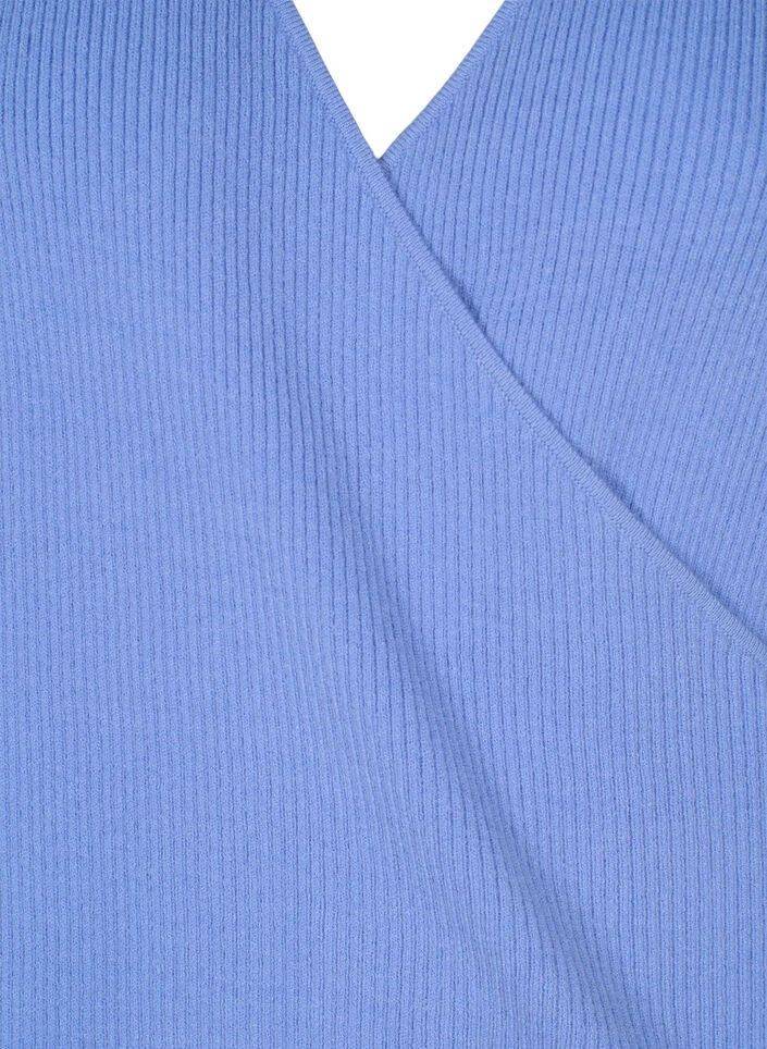 Solid colour jumper in a soft and stretchy rib material. The jumper has a v-neckline with wrap-around effect.