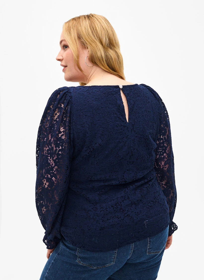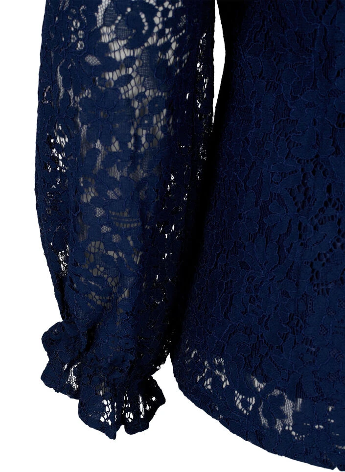 Blouse in beautiful lace quality with soft viscose lining. The blouse has long transparent sleeves with a fine ruffled edge, and a round neckline with a keyhole opening and decorative button at the neck.