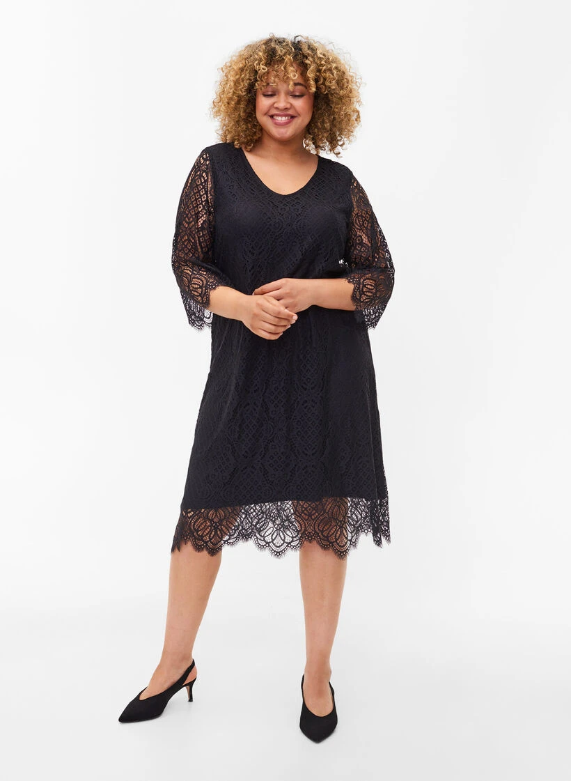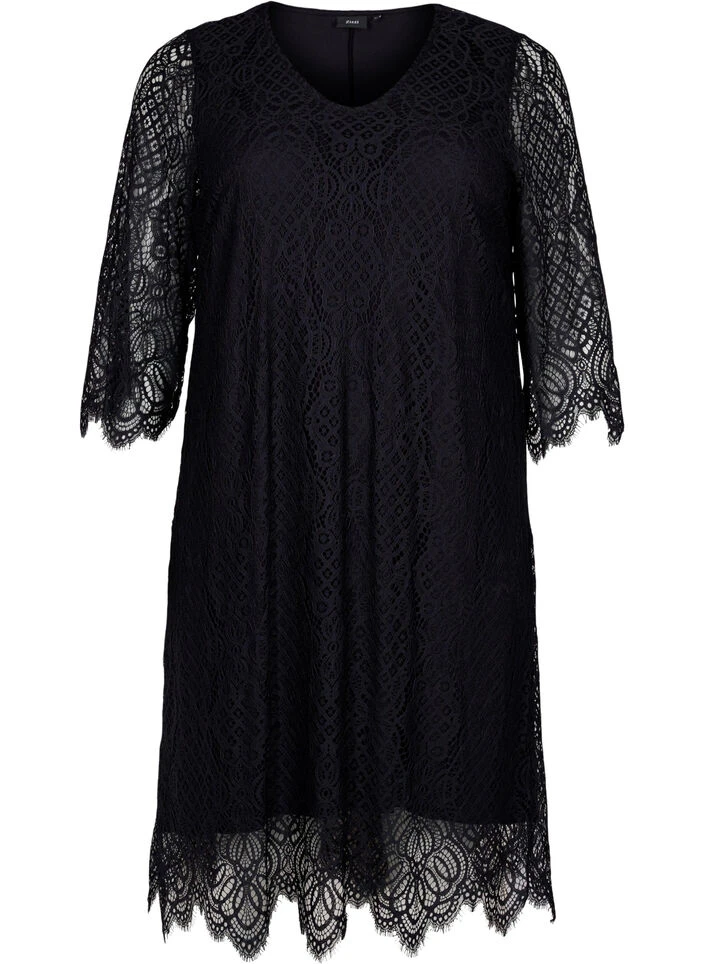 Elegant lace dress with 3/4 sleeves and a v-neckline. The dress is super feminine and falls beautifully on the body and has a slip dress in a soft viscose quality.