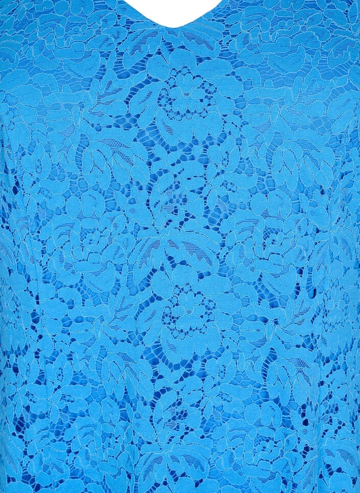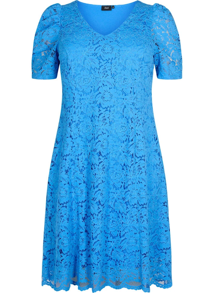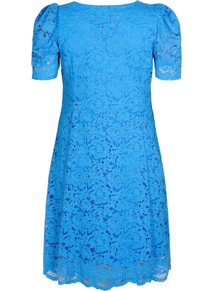 Beautiful and elegant lace dress with v-neckline and fine, short puff sleeves. The dress has a feminine a-cut, which falls nicely.