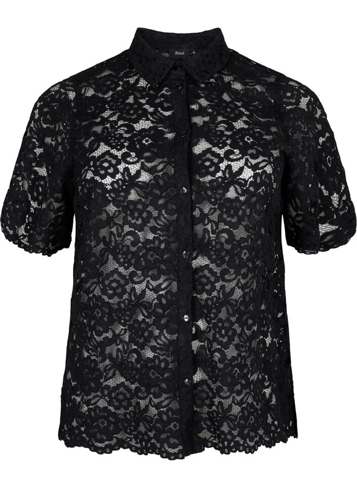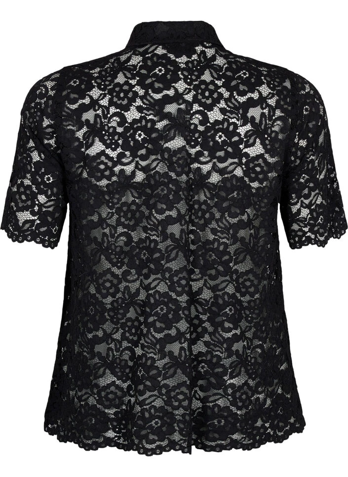 Super feminine shirt in soft and airy lace fabric without lining. The shirt has short sleeves, a classic shirt collar and button closure.