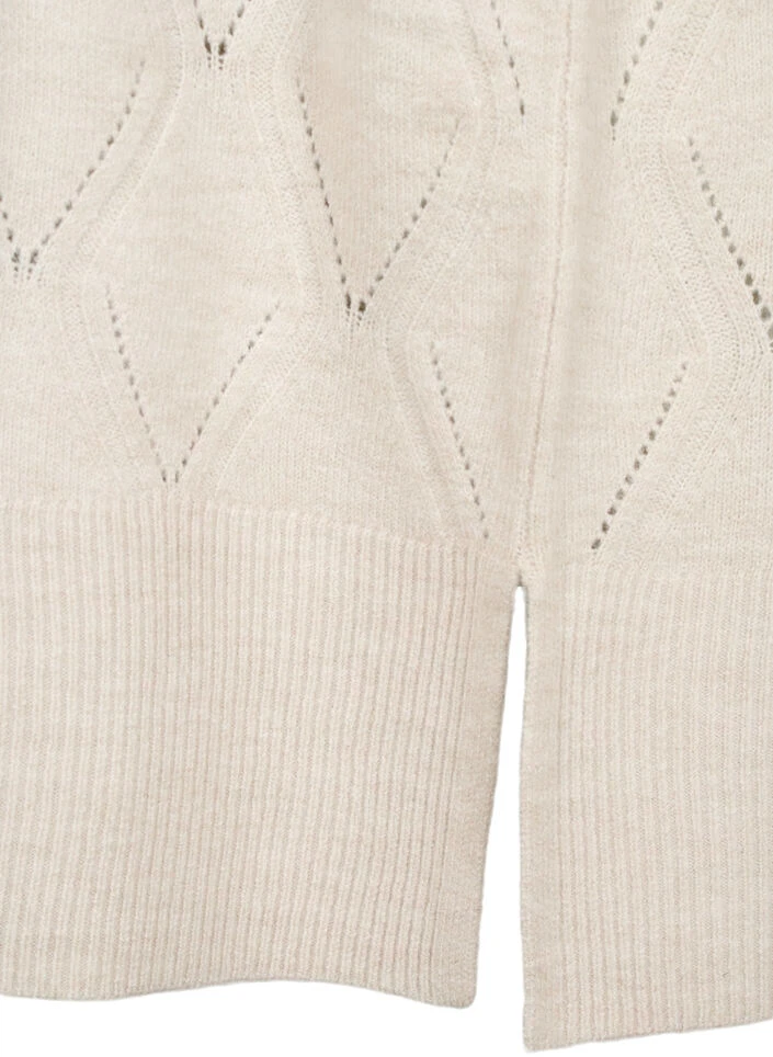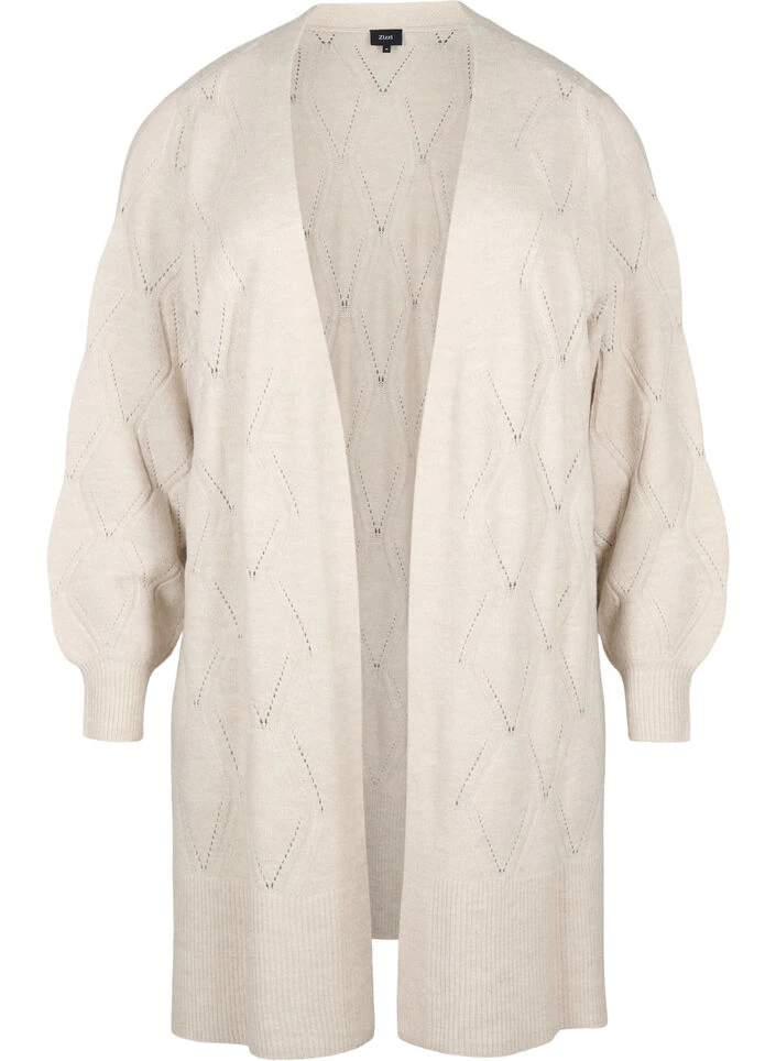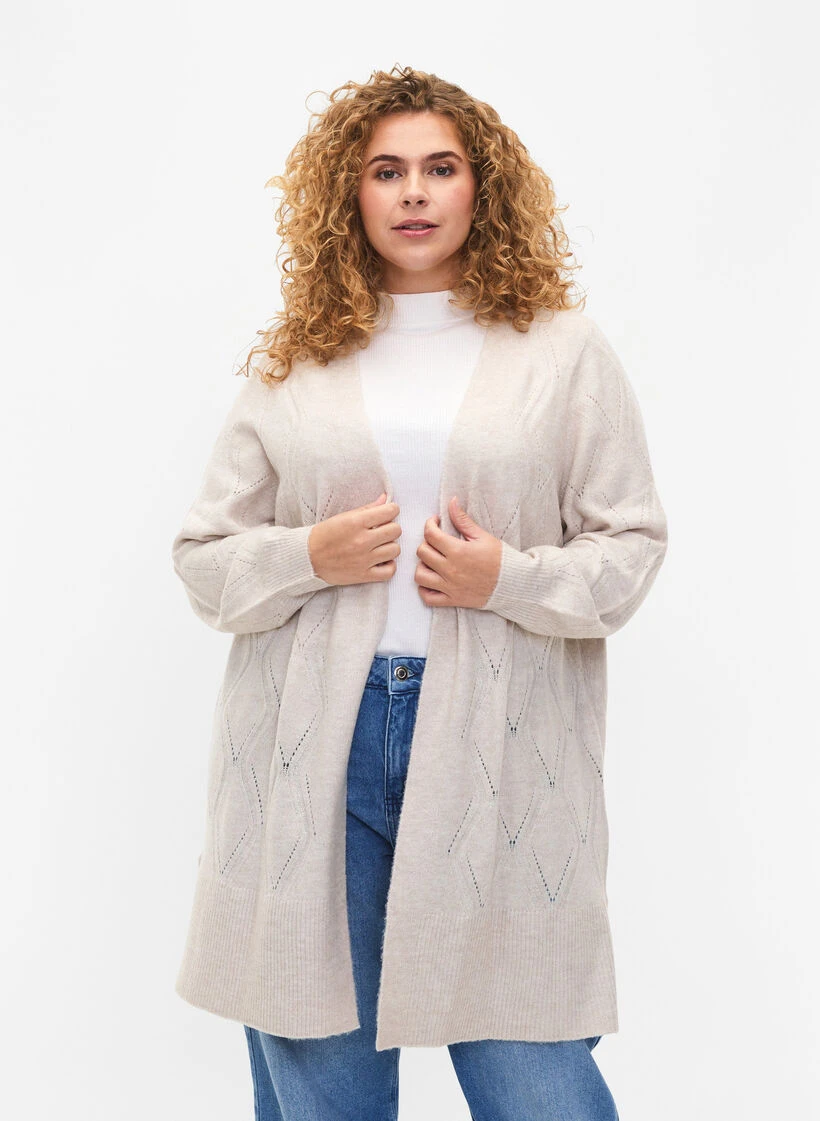 Long knitted cardigan made from a warm and comfortable material with a beautiful hole pattern. This cardigan is designed with wide ribbing on the sleeves and bottom and a side slit.