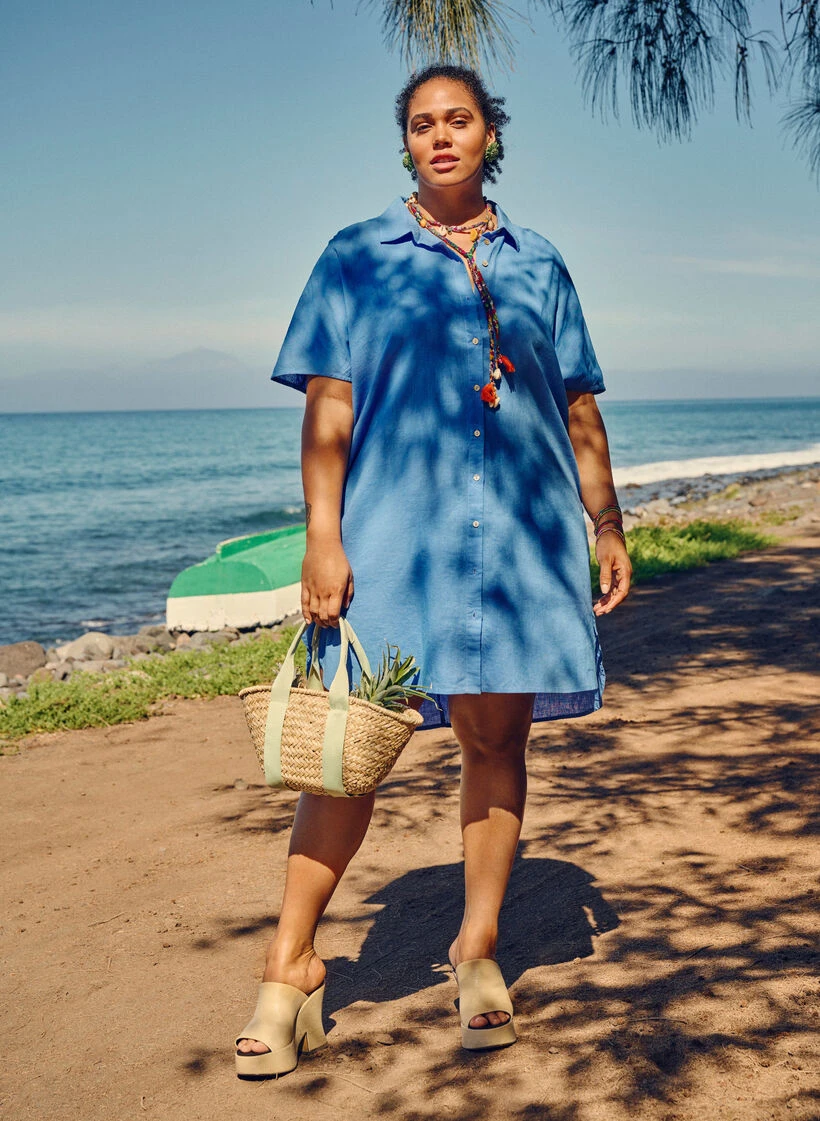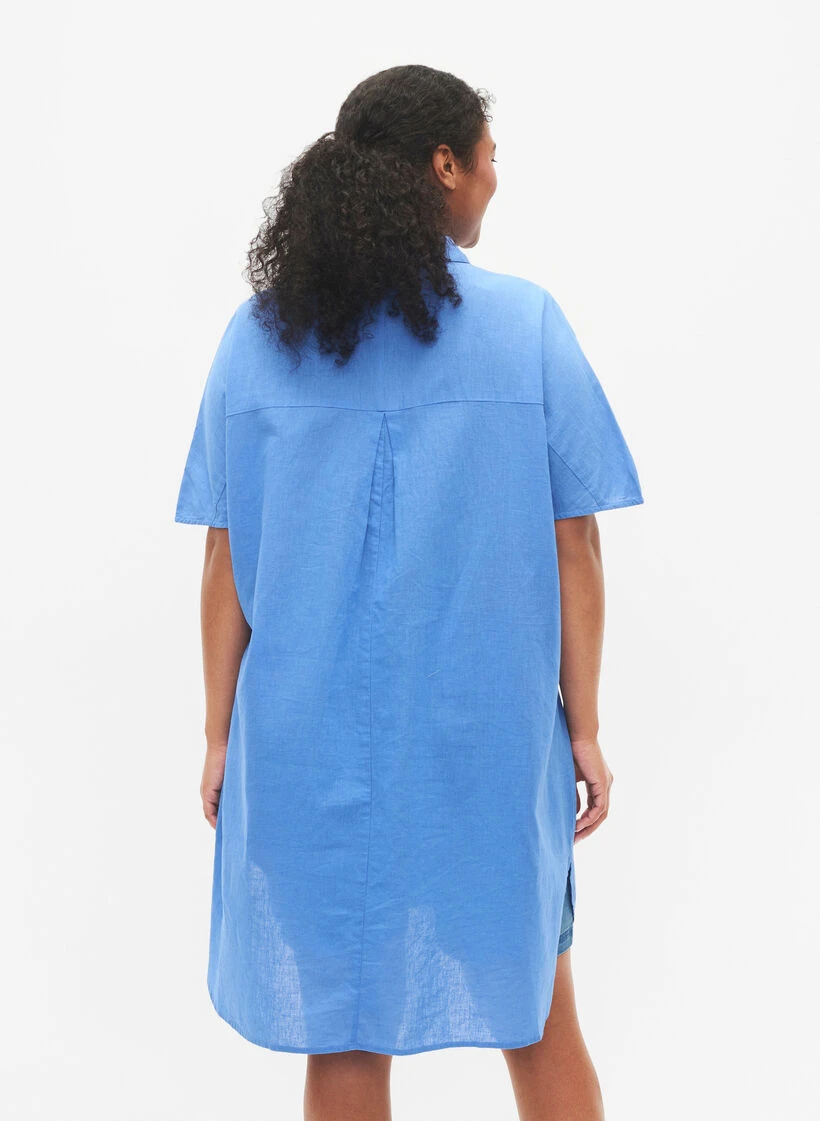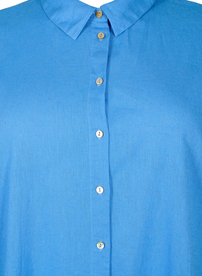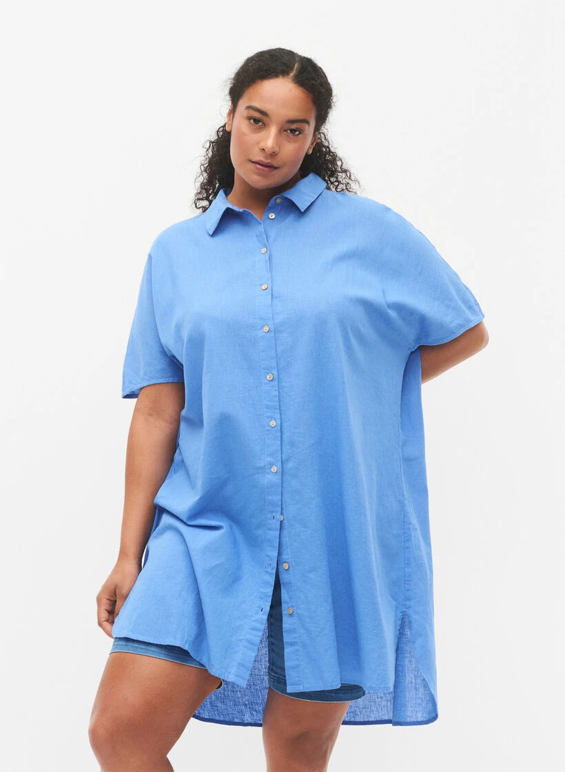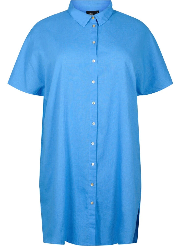 Long loose-fitting shirt with short sleeves and side slits. The shirt is buttoned through at the front, has a classic shirt collar and is made from a comfortable cotton blend with linen.
