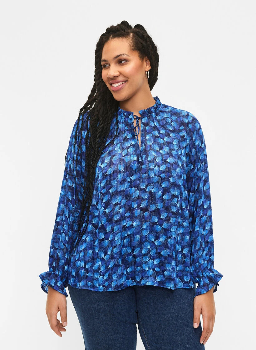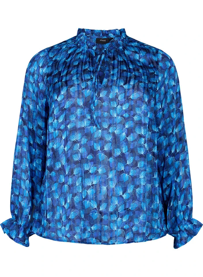 Blouse made from a soft material with 65% recycled polyester and a nice all-over print. The blouse has a fine detail with a tie and ruffle trim at the neck, and ruffle trim on the long sleeves.