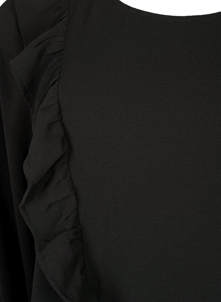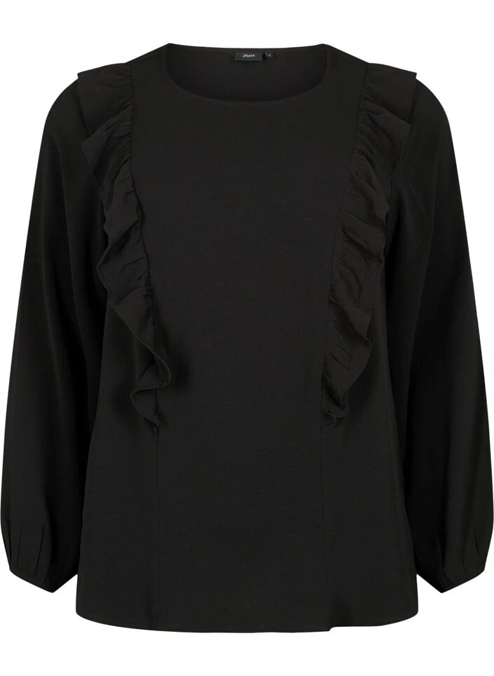 Long-sleeved blouse with a round neckline, made from a quality fabric containing 55% recycled polyester, which drapes lightly on the body. The blouse features feminine ruffles on the front, providing a feminine look.