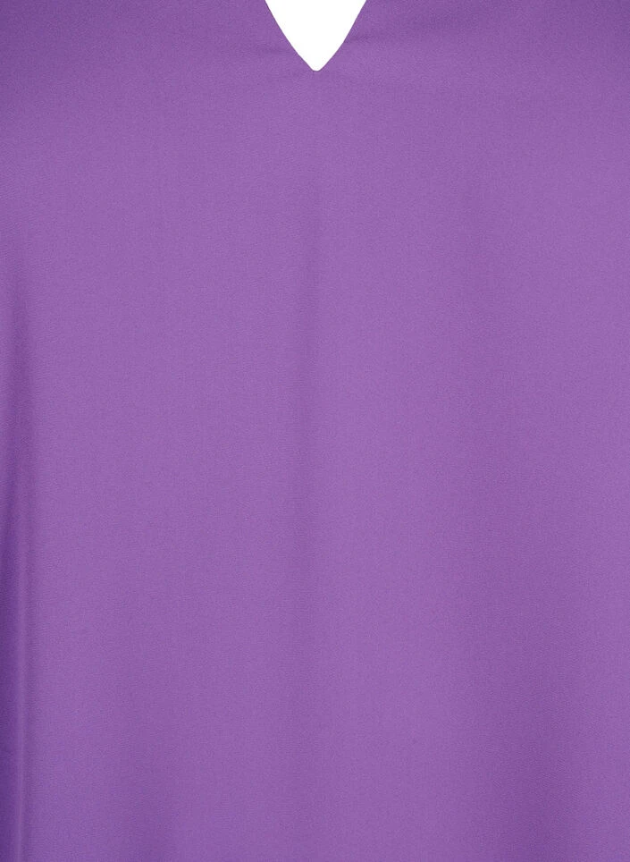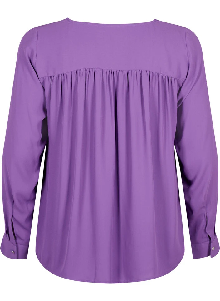 V-neck blouse with long sleeves with cuff and button. The back of the blouse has small wrinkles for a nice drape.