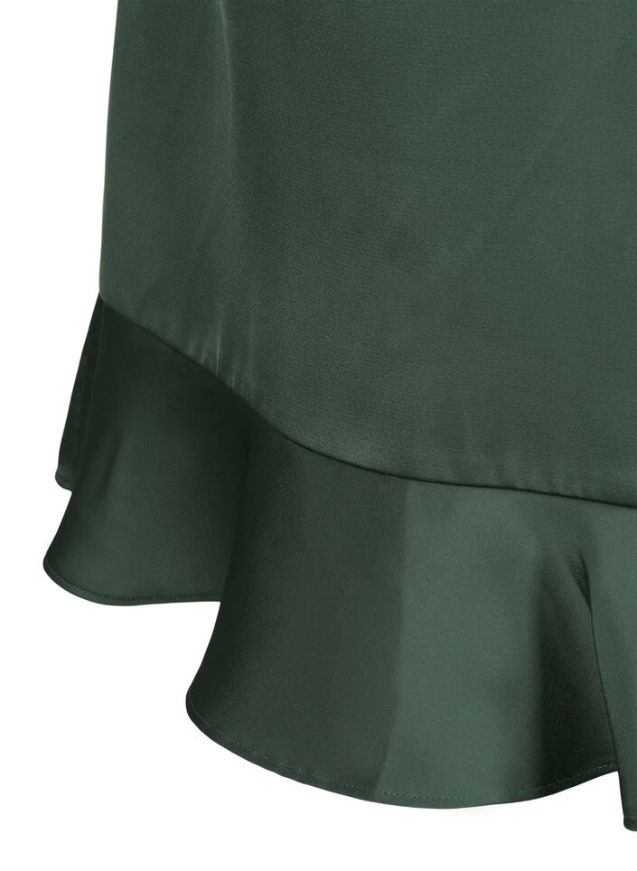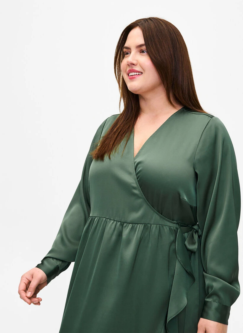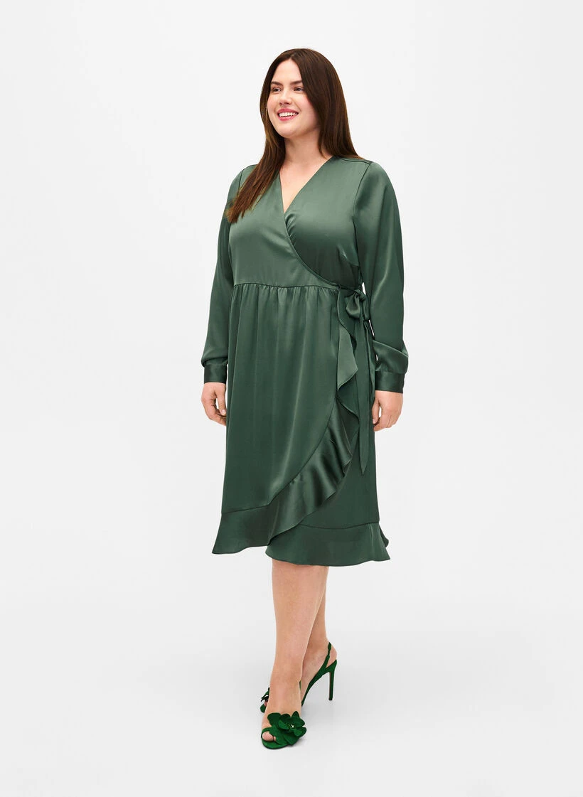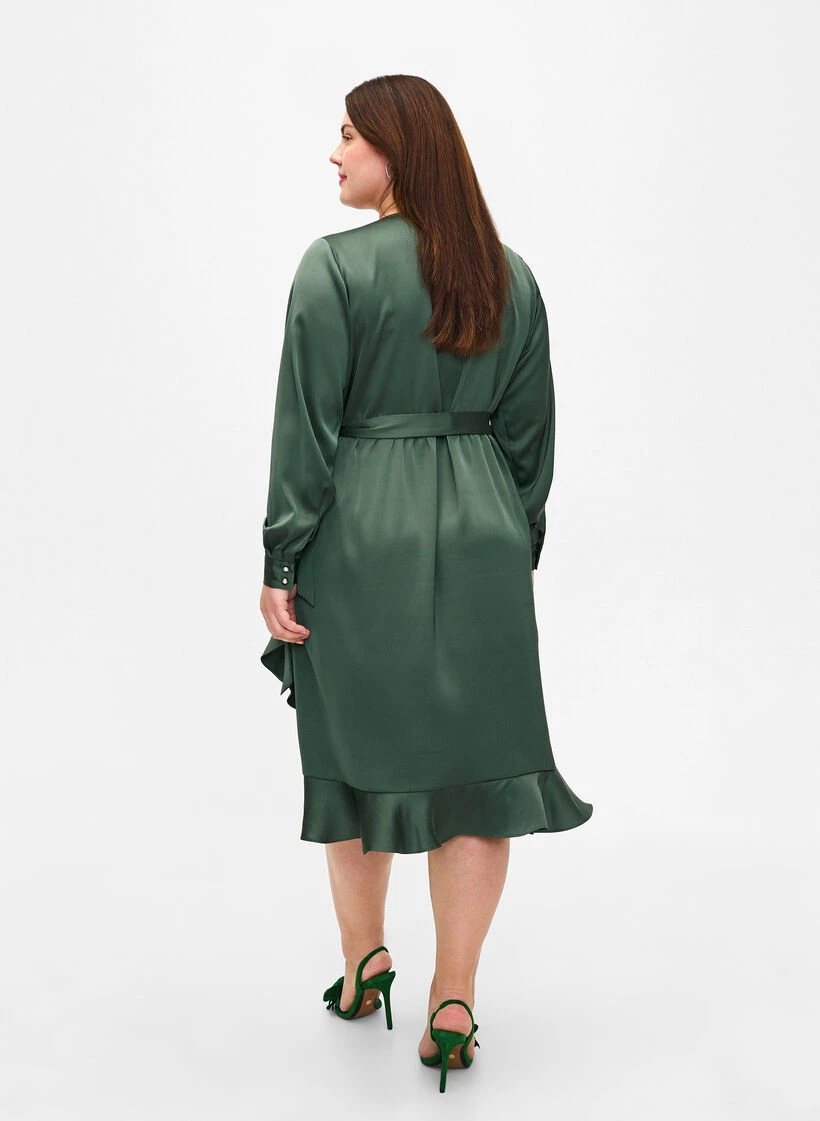 Elegant satin party dress with a wrap-around design that is tied at the side with a fixed tie. The dress has long cuffed sleeves with beautiful buttons and a delicate ruffled hem.
