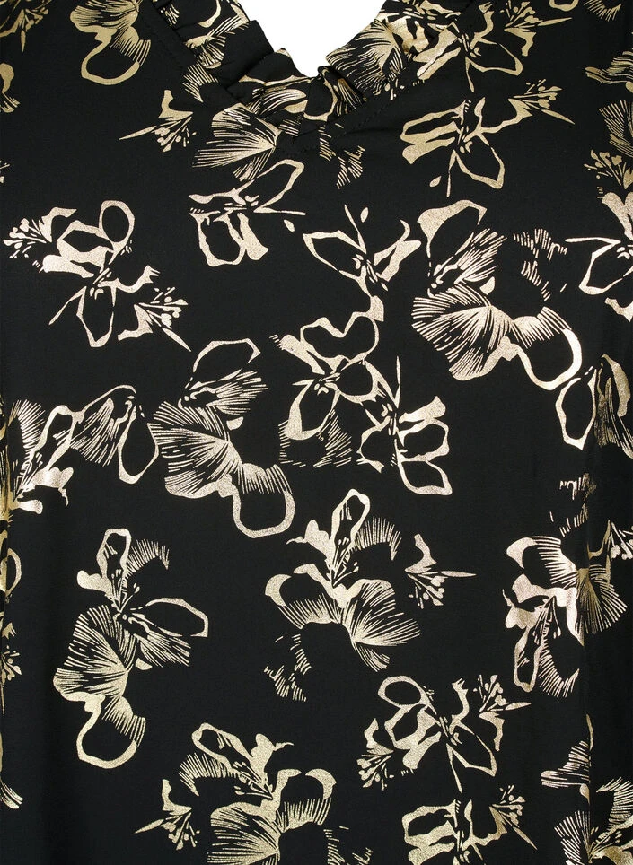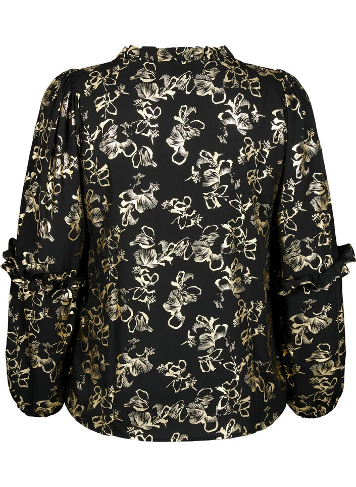 Festive blouse made from a comfortable fabric with 65% recycled polyester and a beautiful gold foil print. The blouse has decorative ruffle details on the V-neckline and long sleeves with elastic cuffs.
